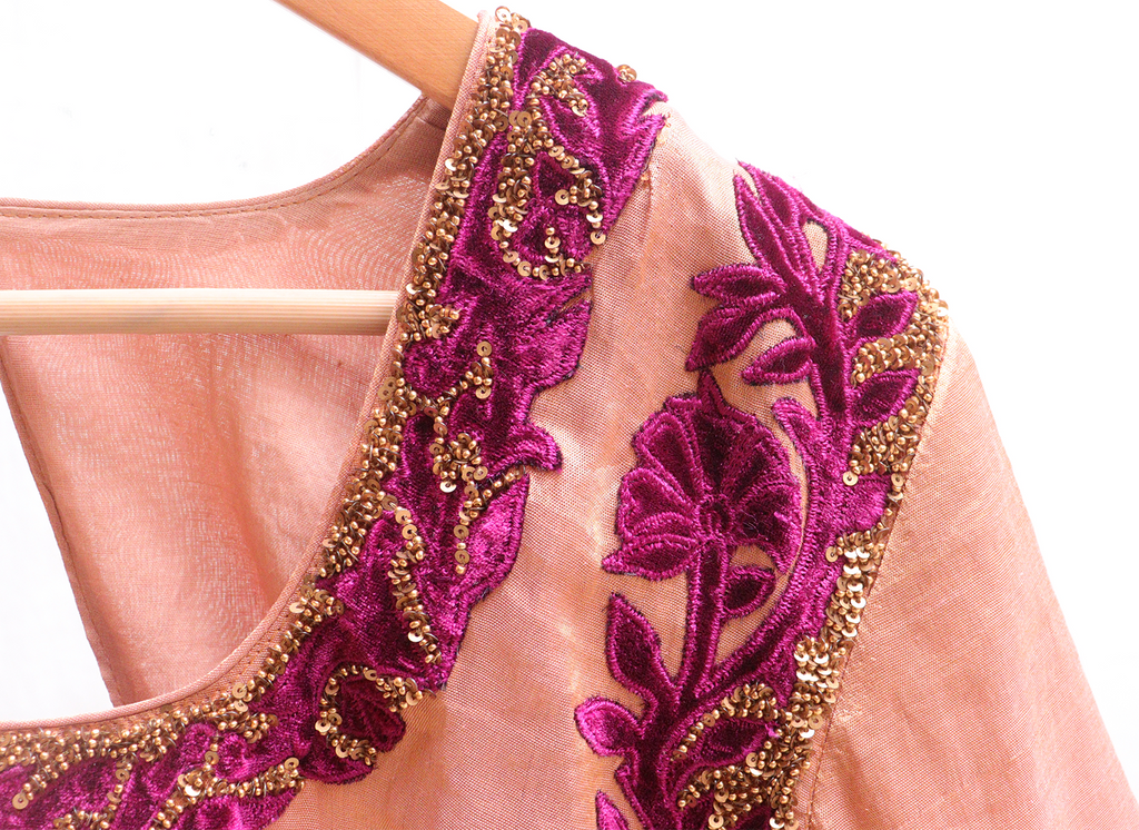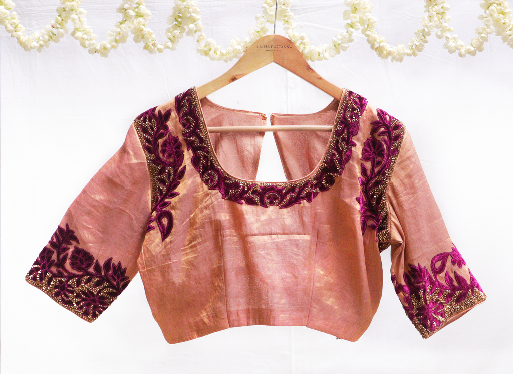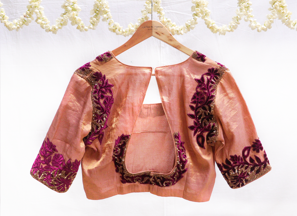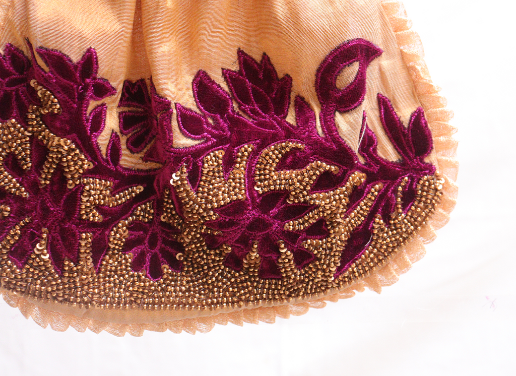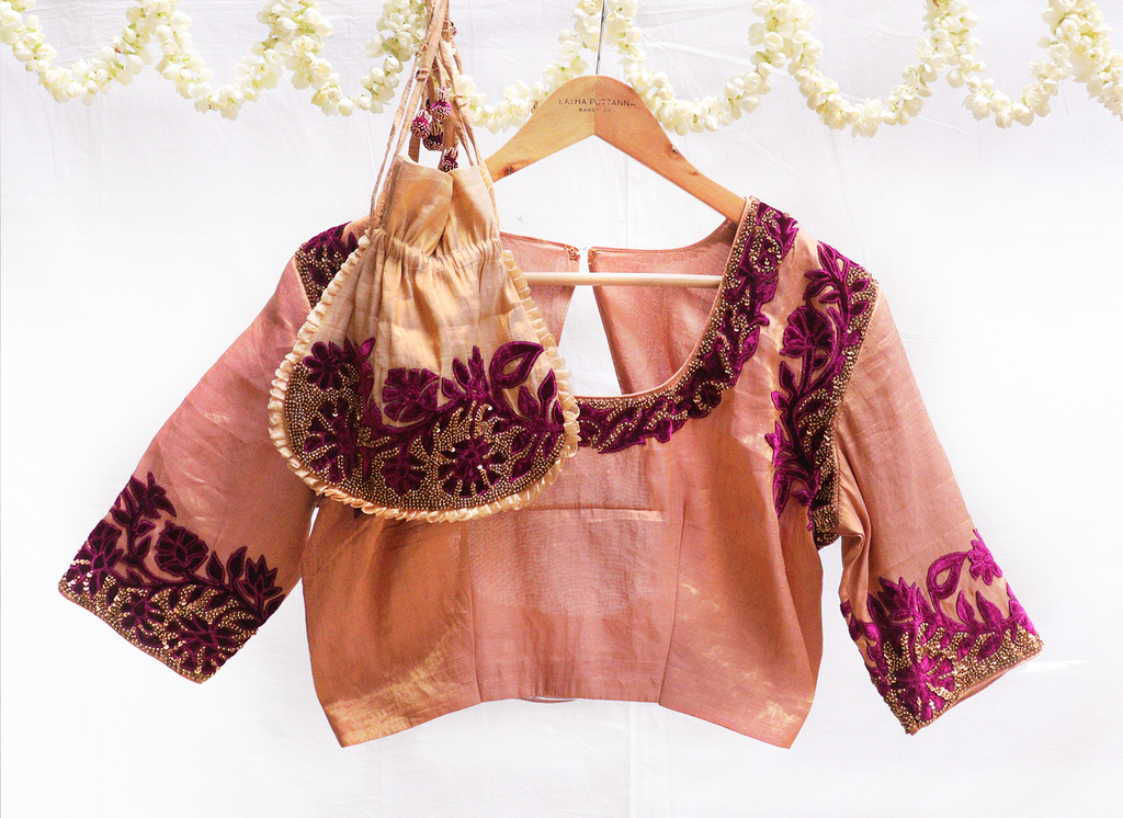 Saucy gold,Kanjeevaram tissue, with maroon velvet applique potli bag. – Latha Puttanna Online Store