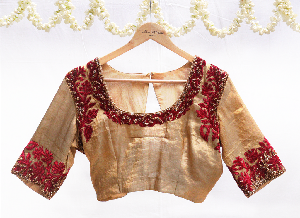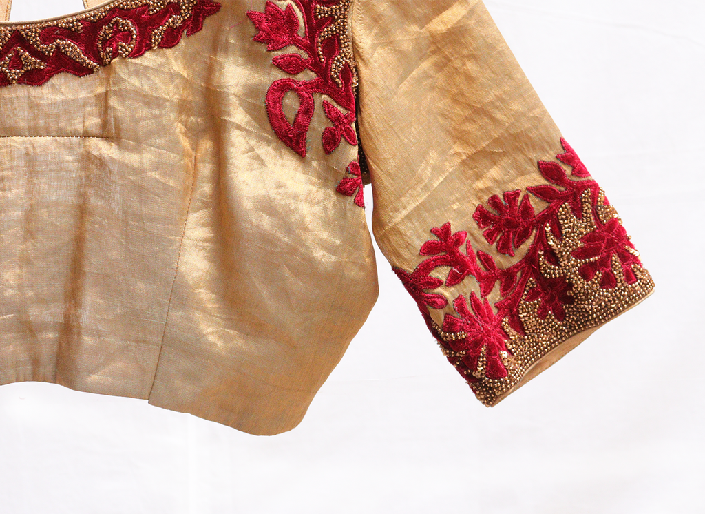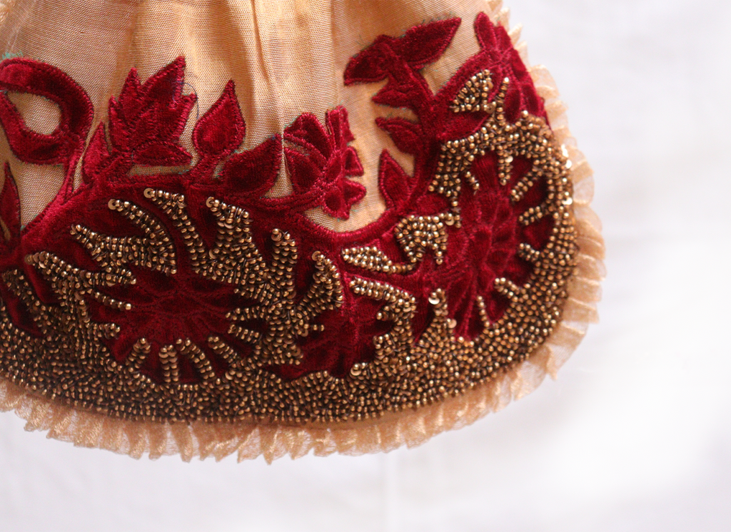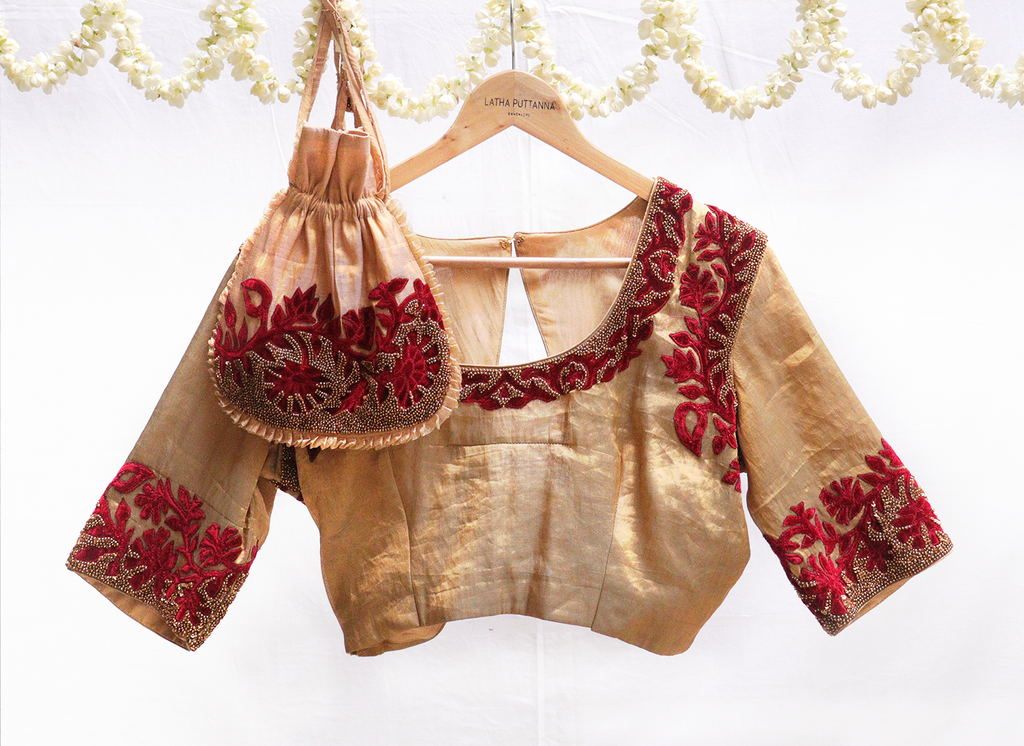 Saucy gold,Kanjeevaram tissue, with red velvet applique potli bag.