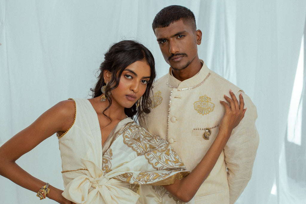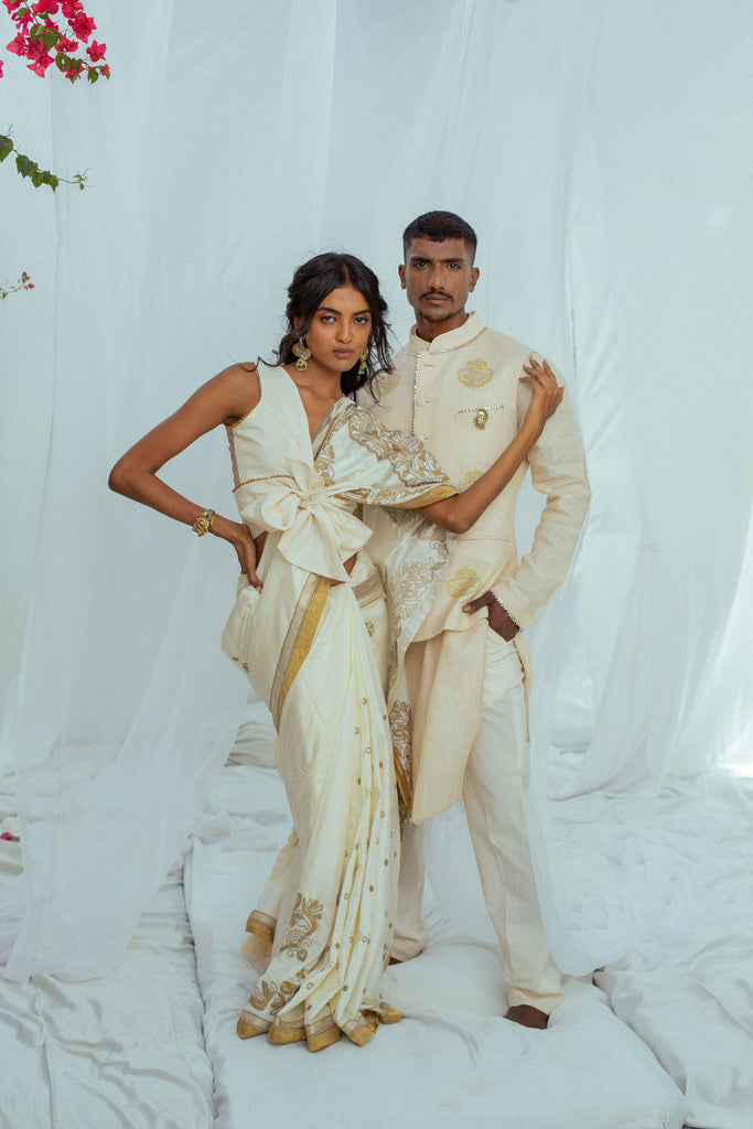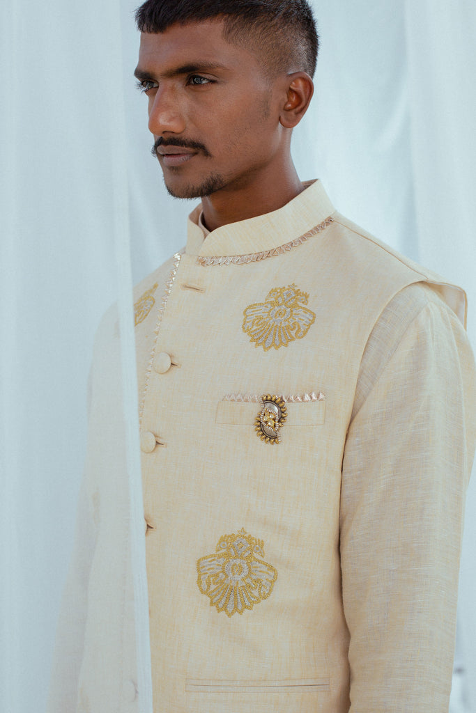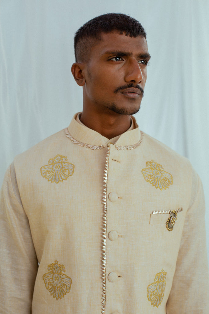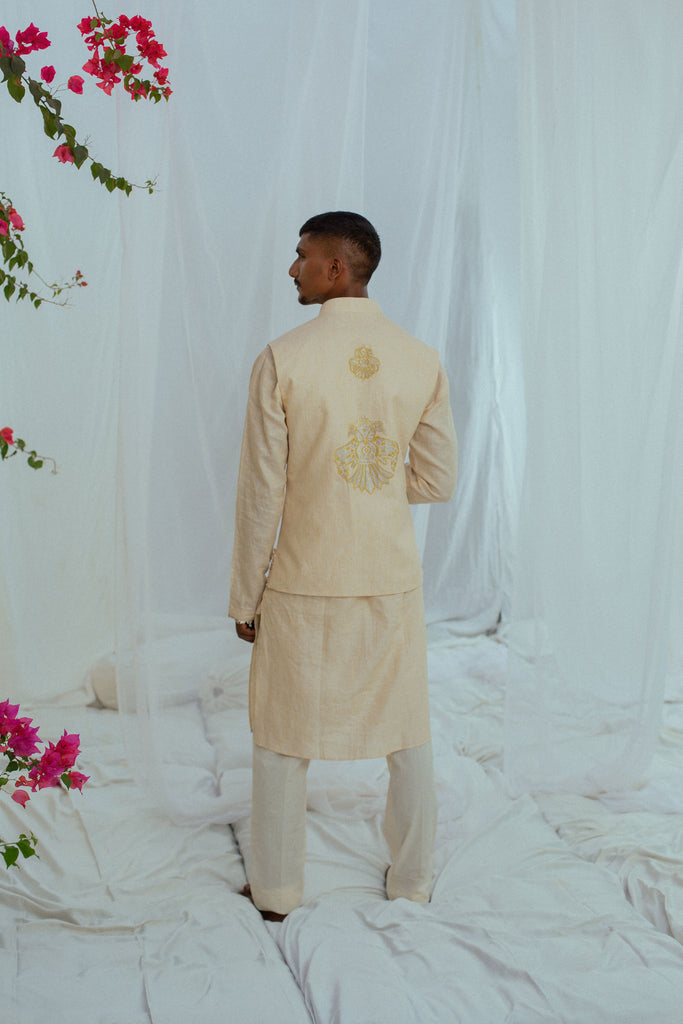 Nothing says summer better than linen – soft, comfortable, and breezy. This linen set of bandi, kurta, and pants in beige, adorned with hand-embroidered motifs of the Gandaberunda bird is the perfect marriage of summer-friendly clothing and your love for the traditional.