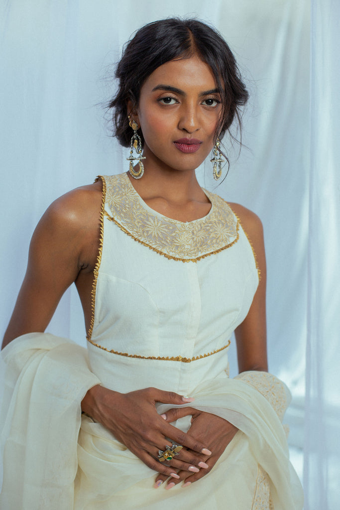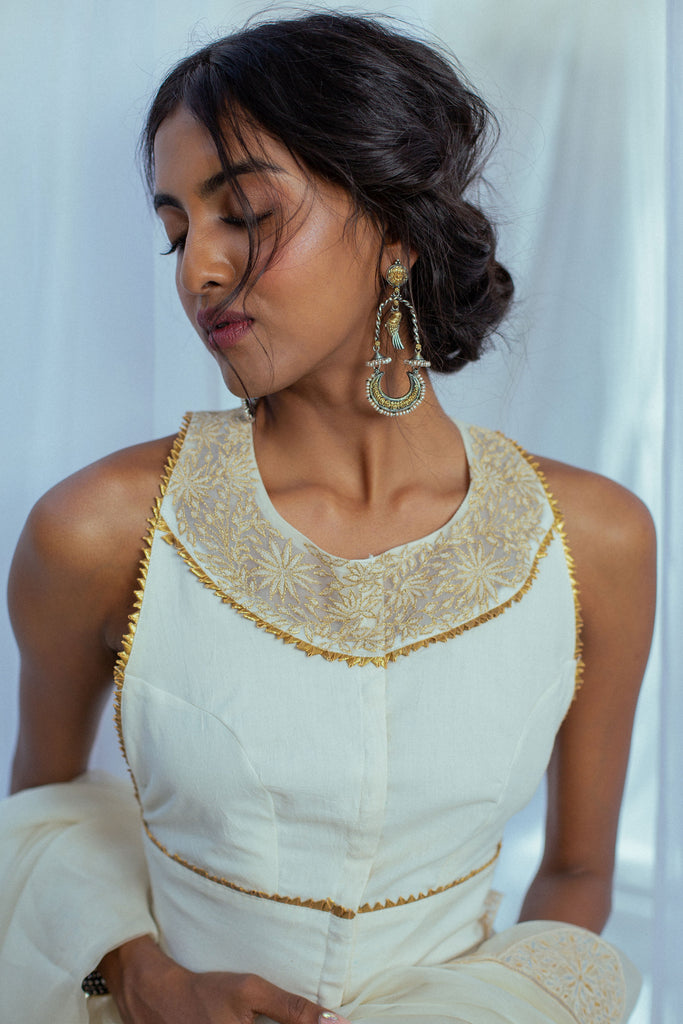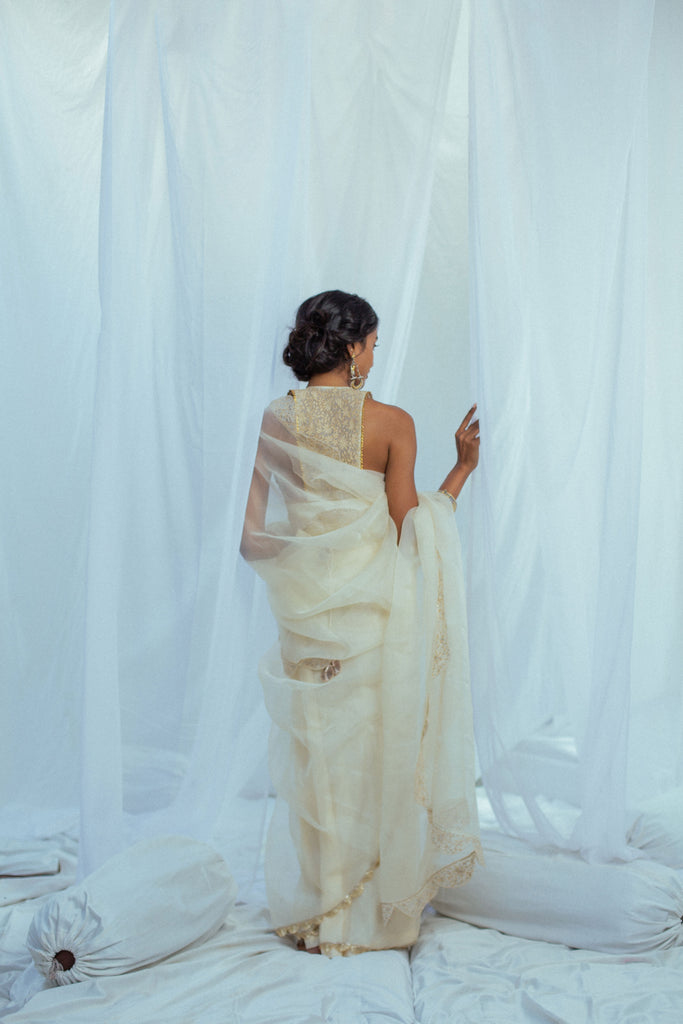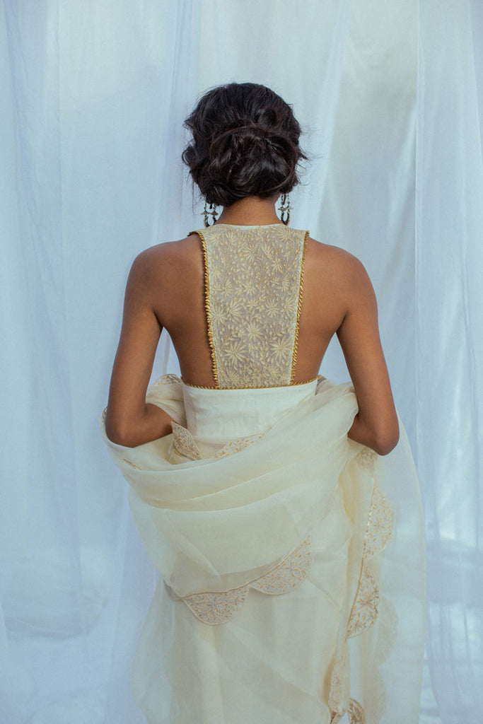 Add this versatile off-white blouse to your wardrobe for a winning traditional or fusion ensemble. Made with premium hand-woven cotton, this blouse is decorated with fine machine embroidery in gold outline with cream filling.