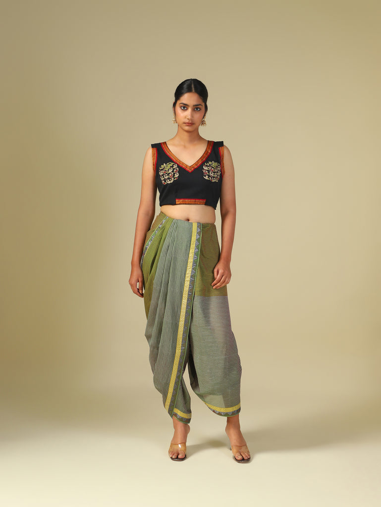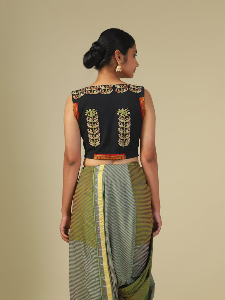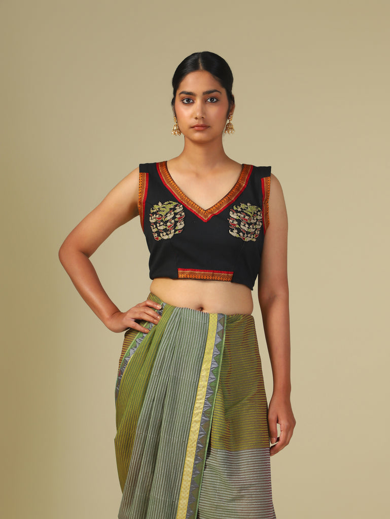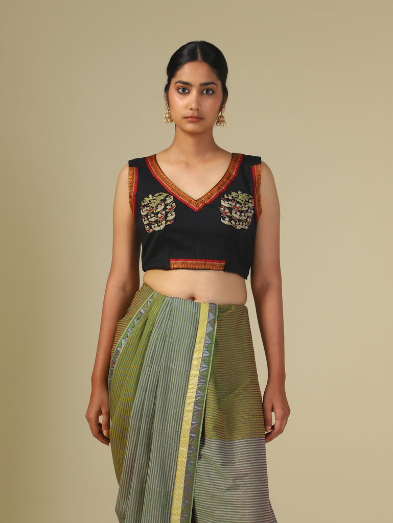 Smoky black stretch cotton knit blouse, elegantly detailed with fine embroidery for a contemporary yet classic look.