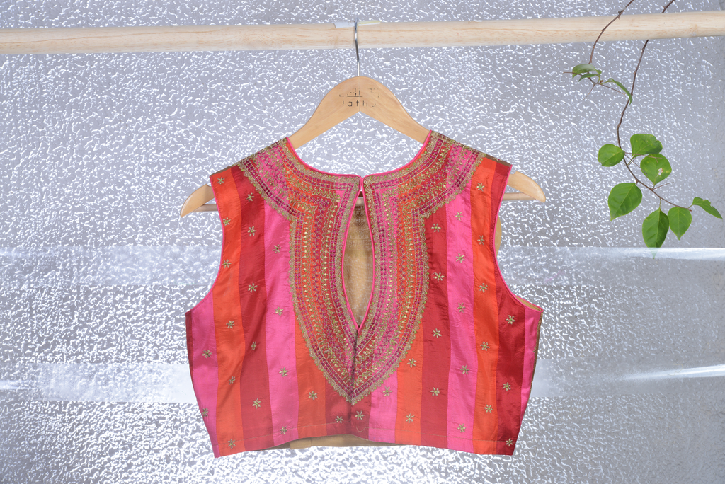Back: Material - Karnataka silk, Colour -Orange and pink, Craft - patchwork and embroidery.