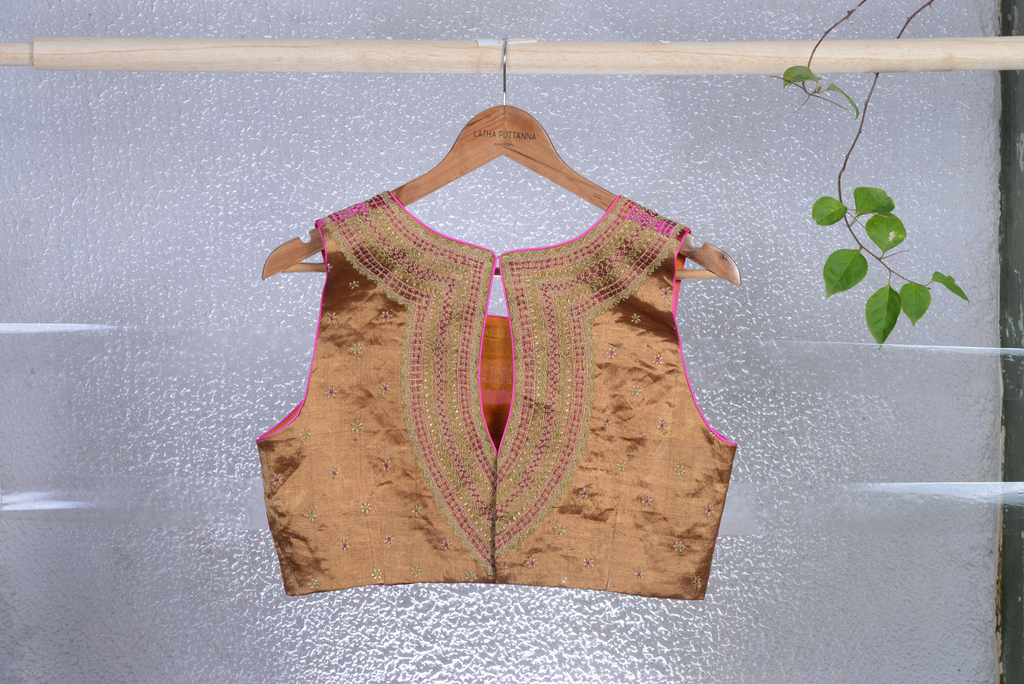 Back: Material - Kanjeevaram Silk Tissue, Colour - antique gold, Craft - Embroidery.