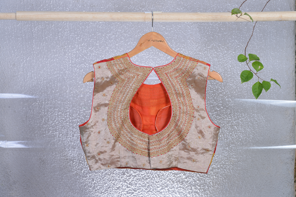 Back: Material - Kanjeevaram Silk Tissue, Colour - Silver, Craft - Embroidery.