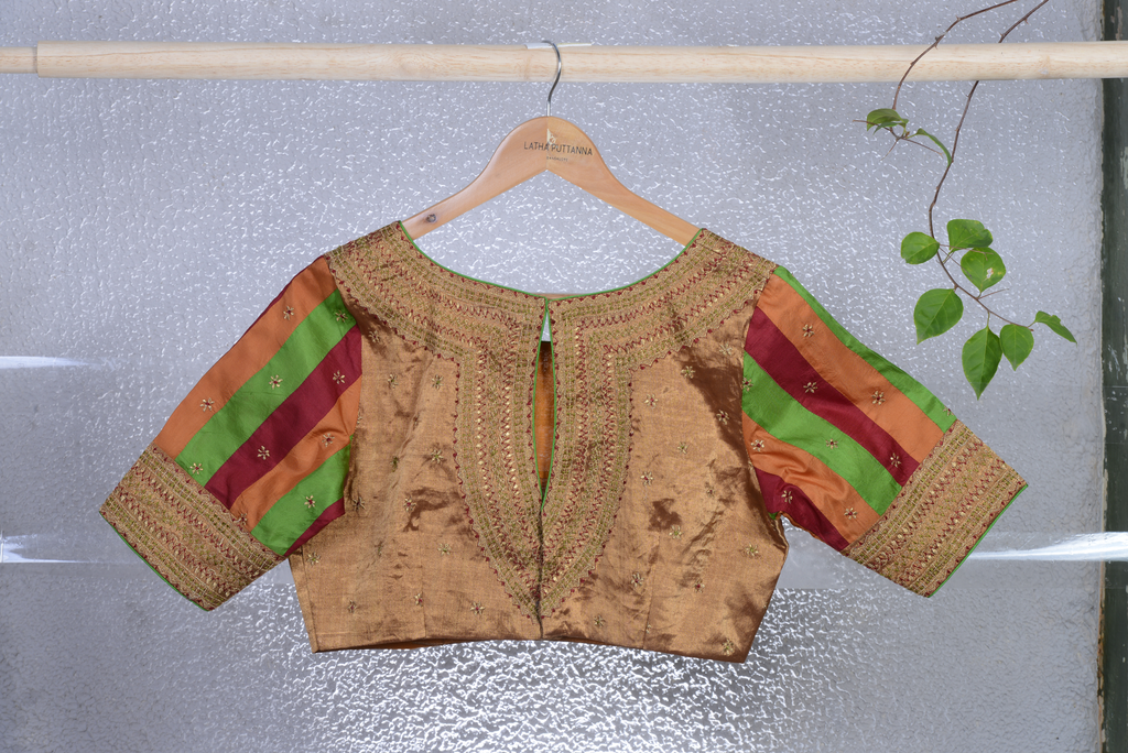 Back: Material - Kanjeevaram Silk Tissue, Colour - antique gold, Craft - Embroidery.