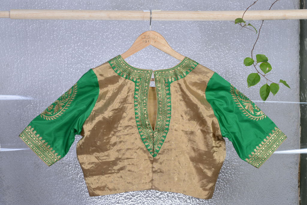 Back: Material - Karnataka silk and Kanjeevarma Tissue, Colour -green and gold, Craft - hand embroidery.