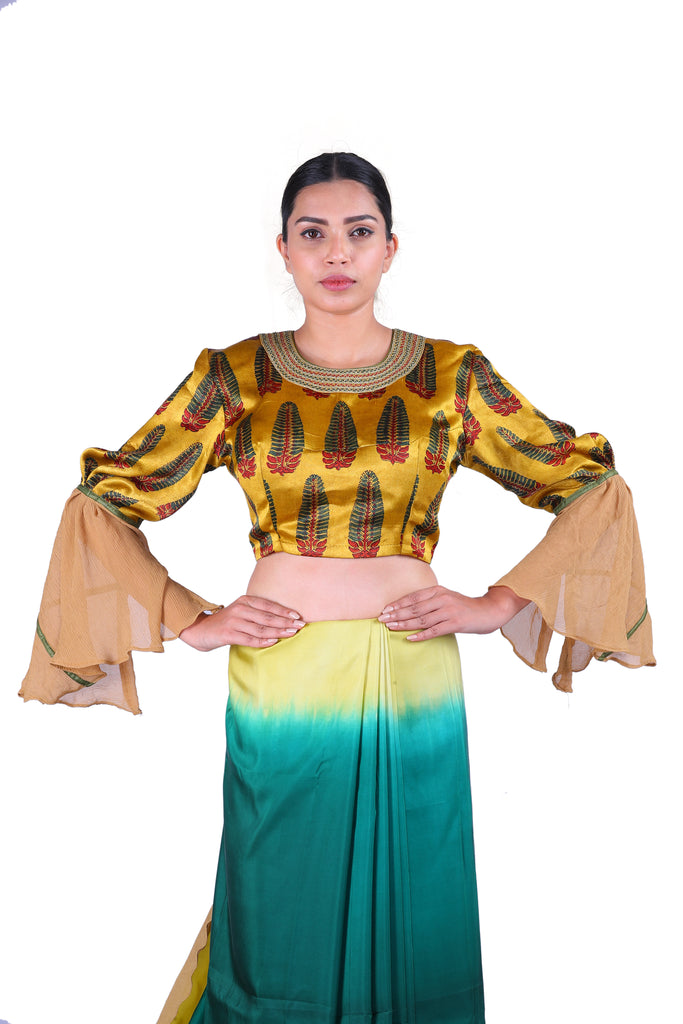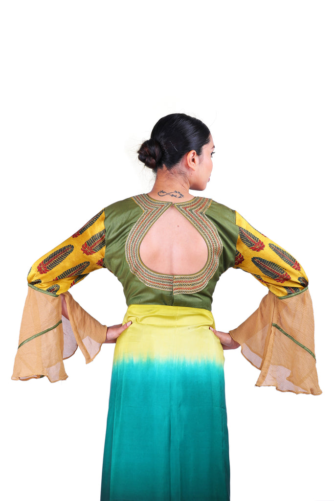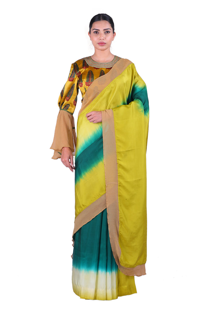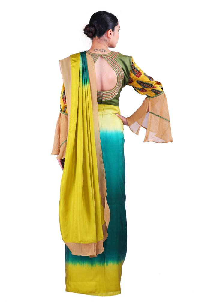 Embody the spirit of a true summer queen! Usher in the summer in style with this gorgeous soft silk saree in two-color dyes with ruffle details in chiffon, paired with a vibrant ajrak gajji silk blouse detailed with flowy bell sleeves in chiffon.