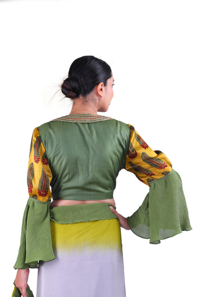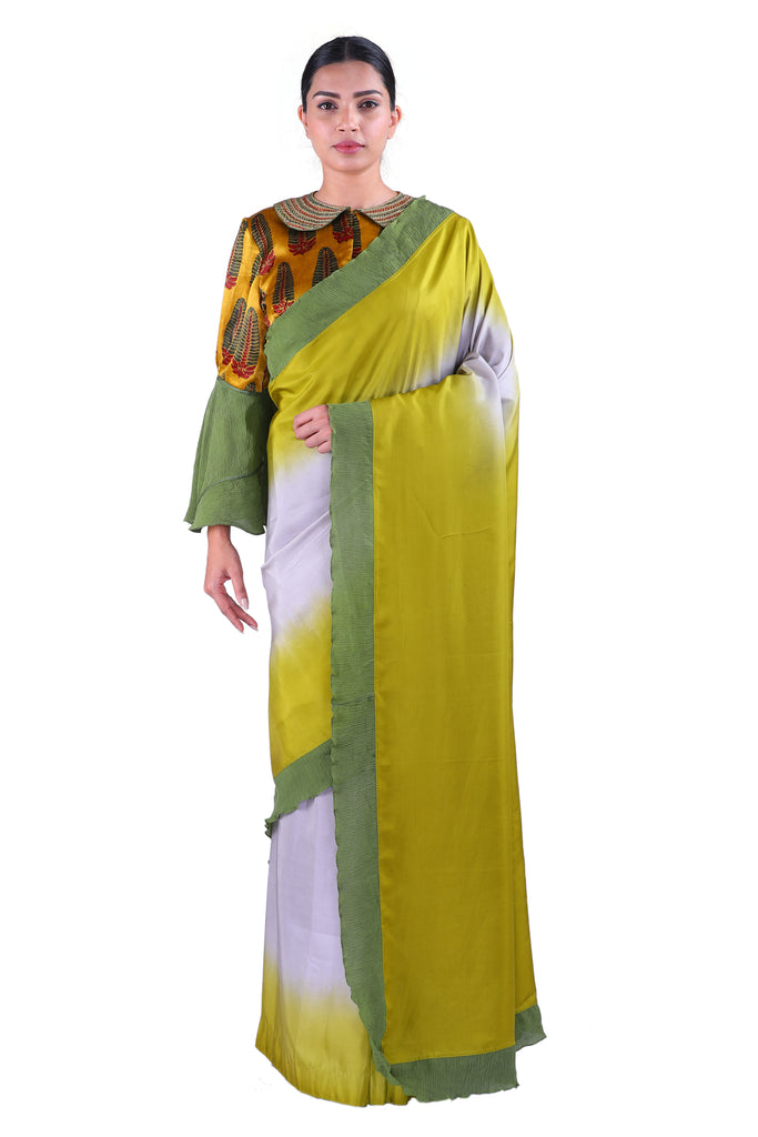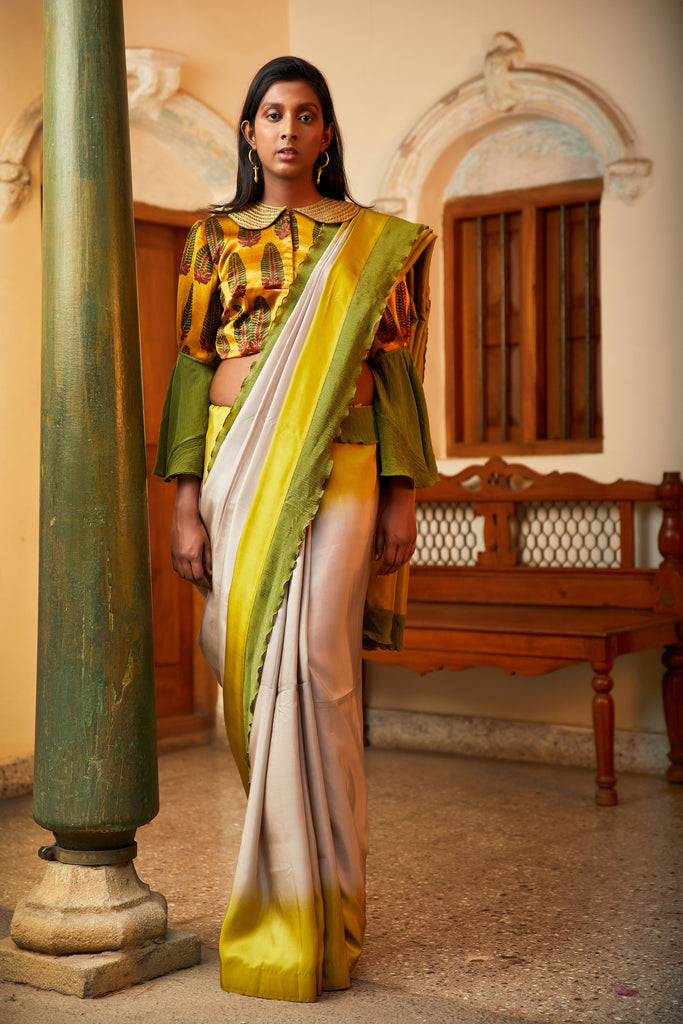 Embody the spirit of a true summer queen! Usher in the summer in style with this gorgeous soft silk saree in two-color dyes with ruffle details in chiffon, paired with a vibrant ajrak gajji silk blouse detailed with flowy bell sleeves in chiffon.