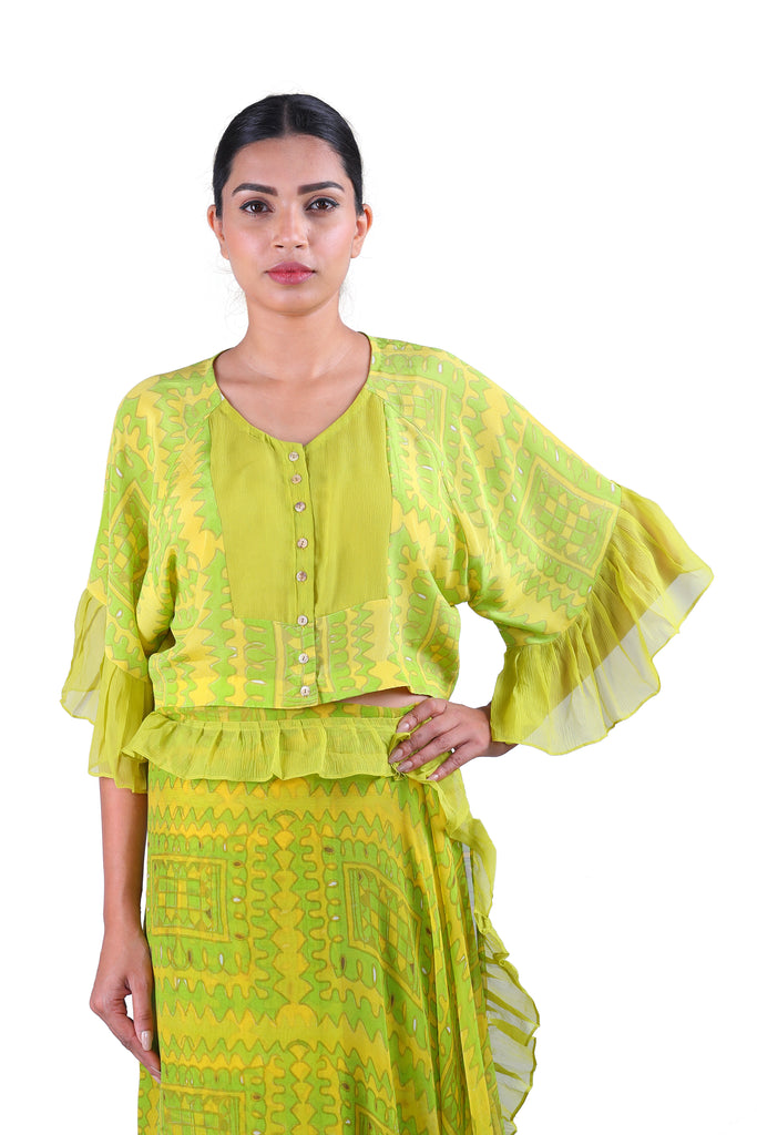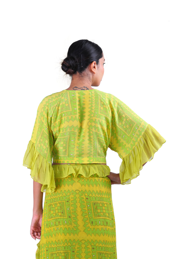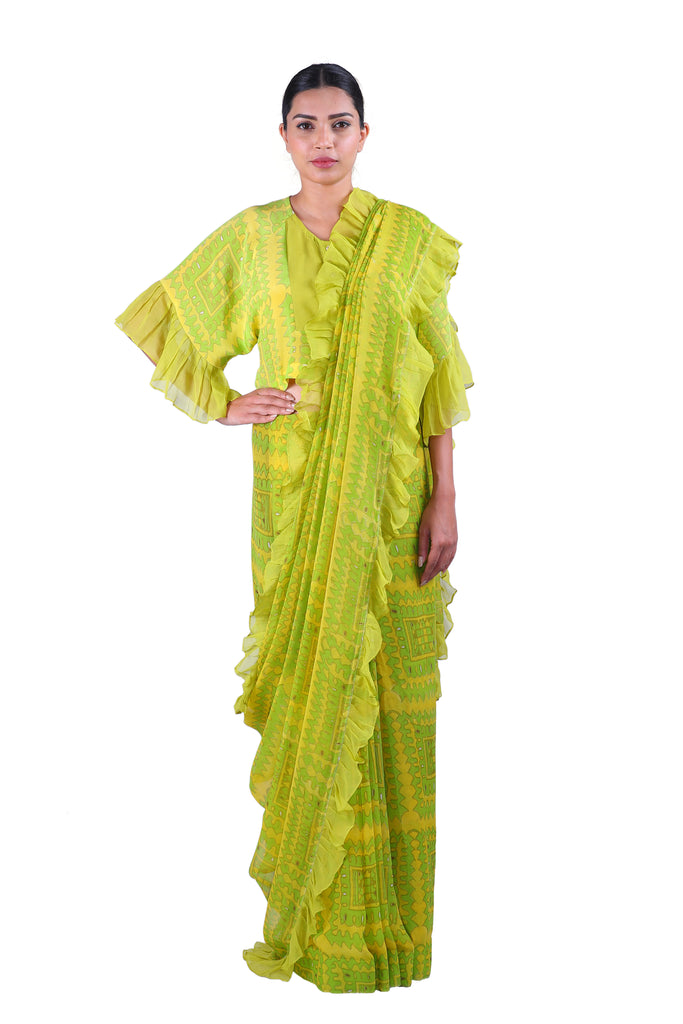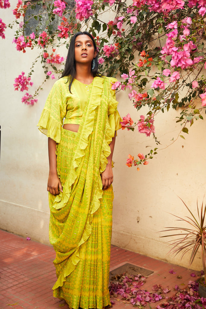 Ready to bring back the glory days of the Bengaluru summer? Nothing says it better than these classic Lemon yellow printed chiffon sarees with iconic Latha Puttanna prints, embellished with ruffles and paired with a matching blouse.