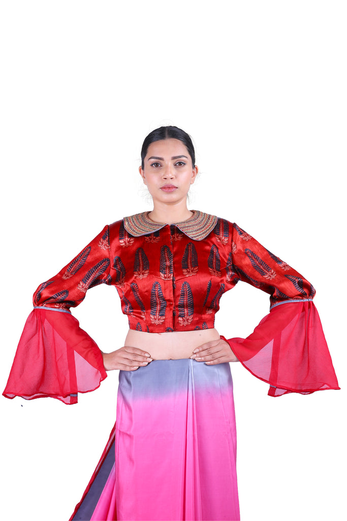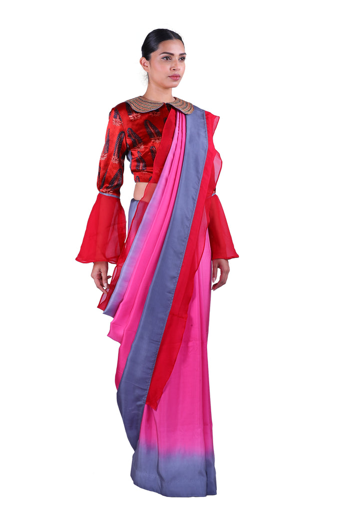 Embody the spirit of a true summer queen! Usher in the summer in style with this gorgeous soft silk saree in two-color dyes with ruffle details in chiffon, paired with a vibrant ajrak gajji silk blouse detailed with flowy bell sleeves in chiffon.