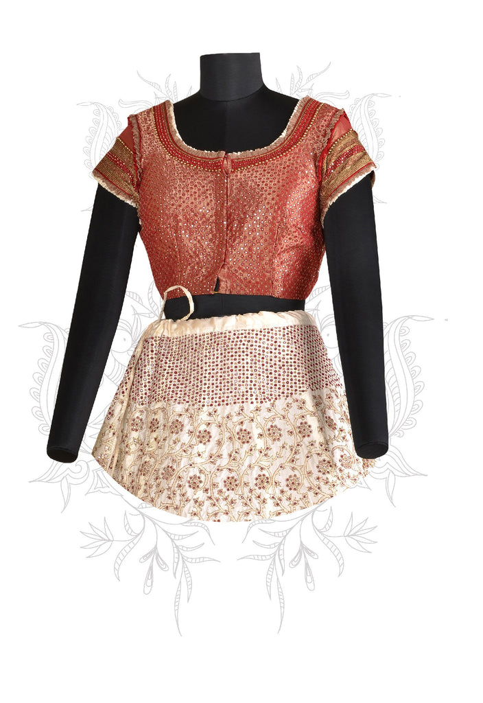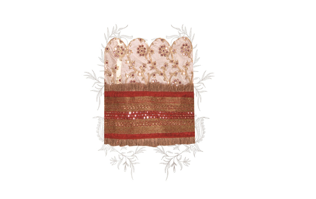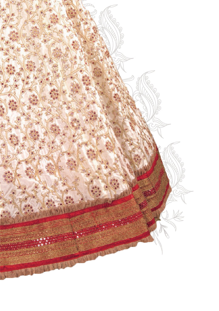 If you like something understated yet not underwhelming, this lehenga set is the one for you. With a silk langa in white and red that's detailed with intricate mirrors, kundans, and our classic 'Tiya border' hand embroidery in gold zari, this ensemble is completed with a red silk blouse with heavy mirror work and the 'Tiya border' design on the sleeves and a delicate silk net dawani.