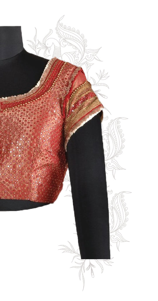 Blouse: Fully embroidered with baby mirrors, Tiya border on the sleeve and a delicate gold frill
