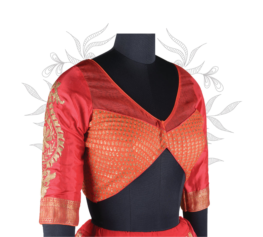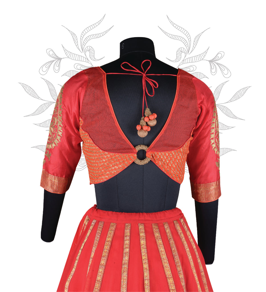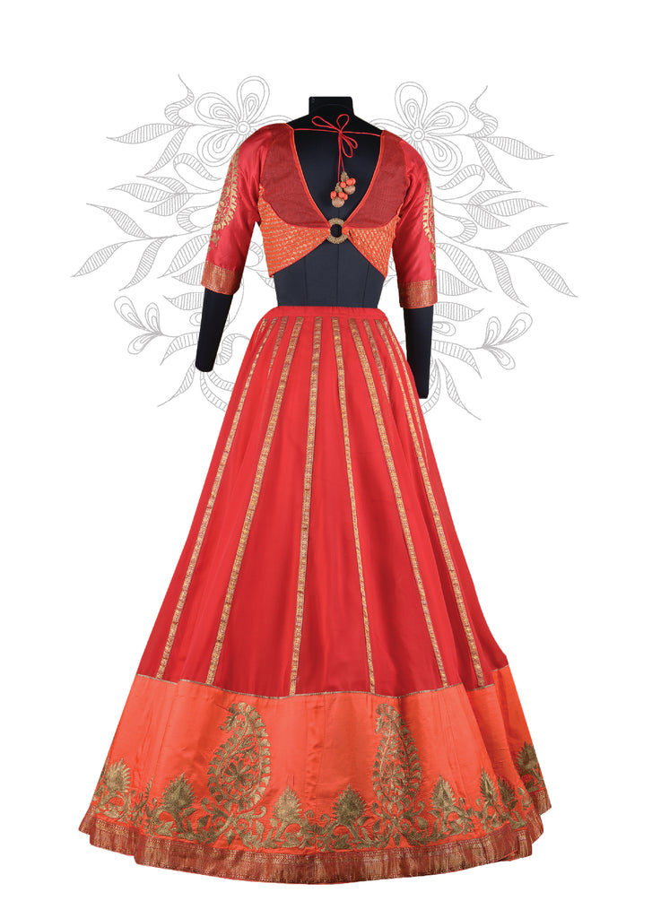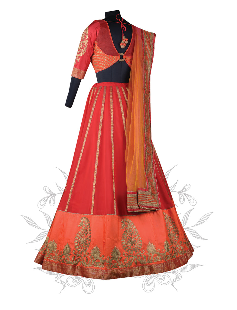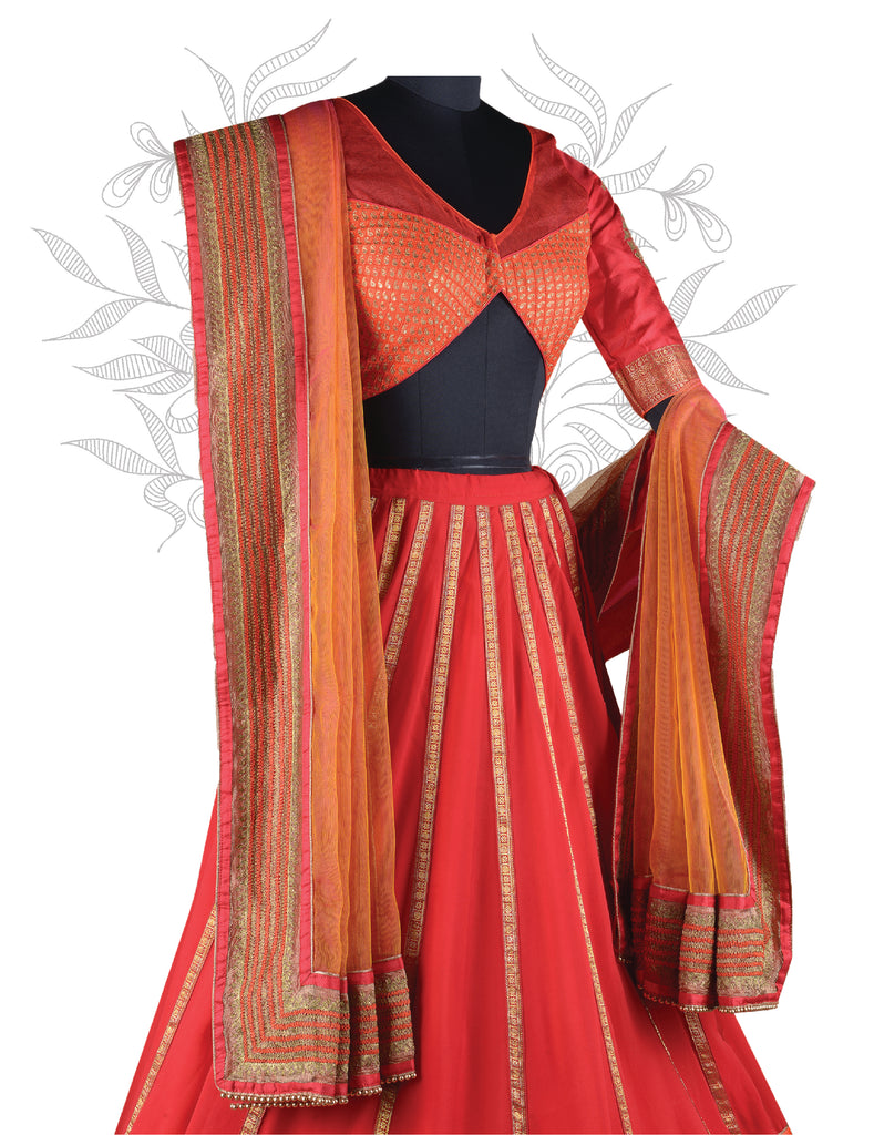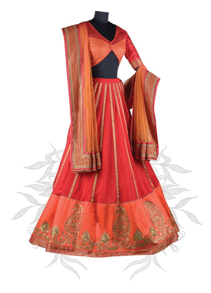 Make heads turn on your special day with this fiery orange lehenga set, comprising a georgette and silk paneled skirt with traditional paisleys and peacock feather motifs in gold zari and a larger-than-life border. To create balance, we threw in a light and breezy silk net dupatta with 'Ole-Jaal' hand embroidery and a silk and silk net blouse with a sequined bust and a sexy cut at the waist.