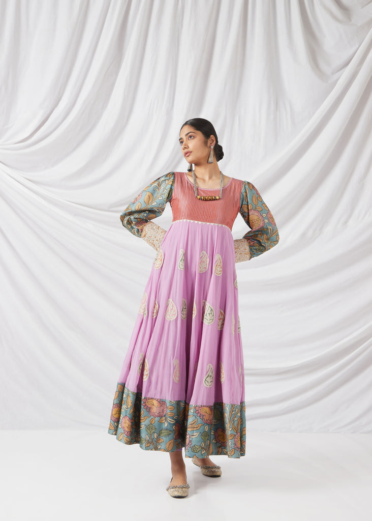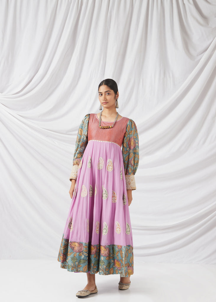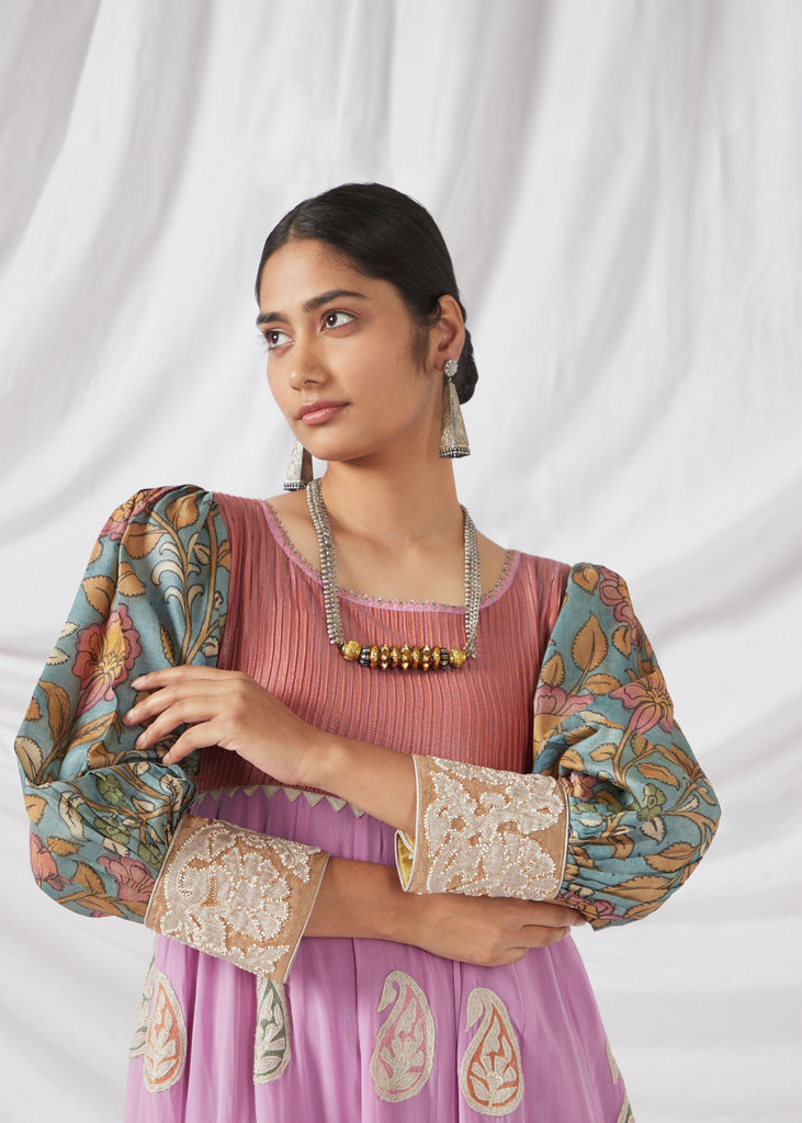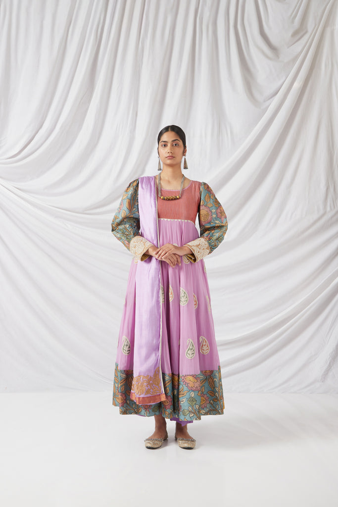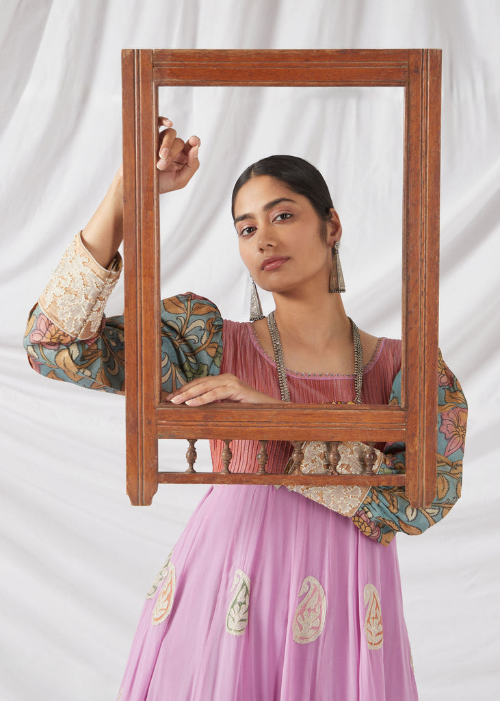 The Sevanthige Salwar Set in Rouge Pink and Lilac features delicate Kalamkari detailing, blending soft hues with traditional craftsmanship. Perfect for special occasions, it’s a graceful fusion of modern style and timeless artistry.
