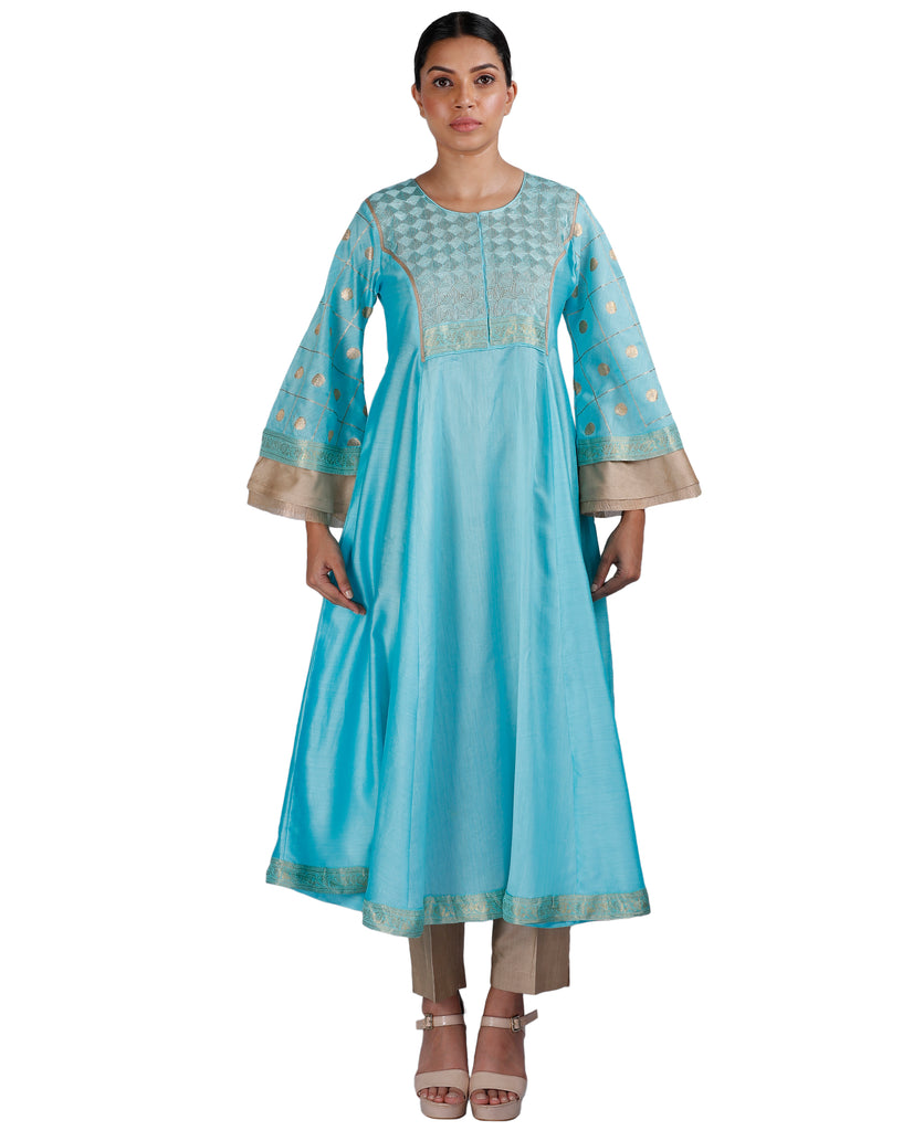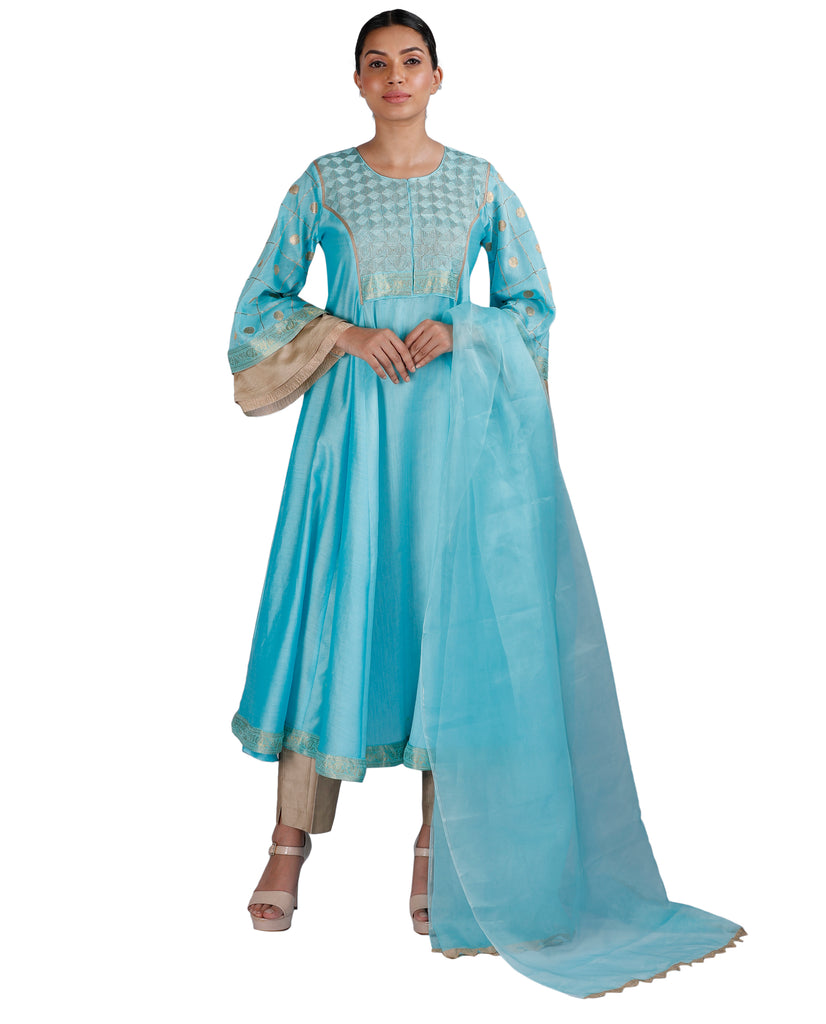 Bring out the inner goddess in you with this stunning fit and flared chanderi kurta in blue embellished with intricate hand embroidery on yoke and bell-sleeves. Complete the look with a gold straight pants and a organza dupatta in blue.