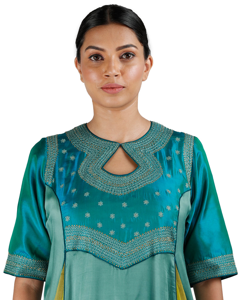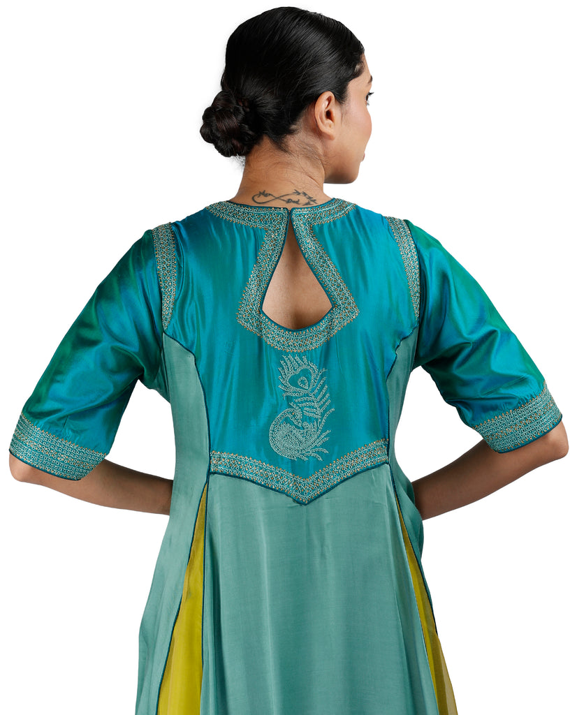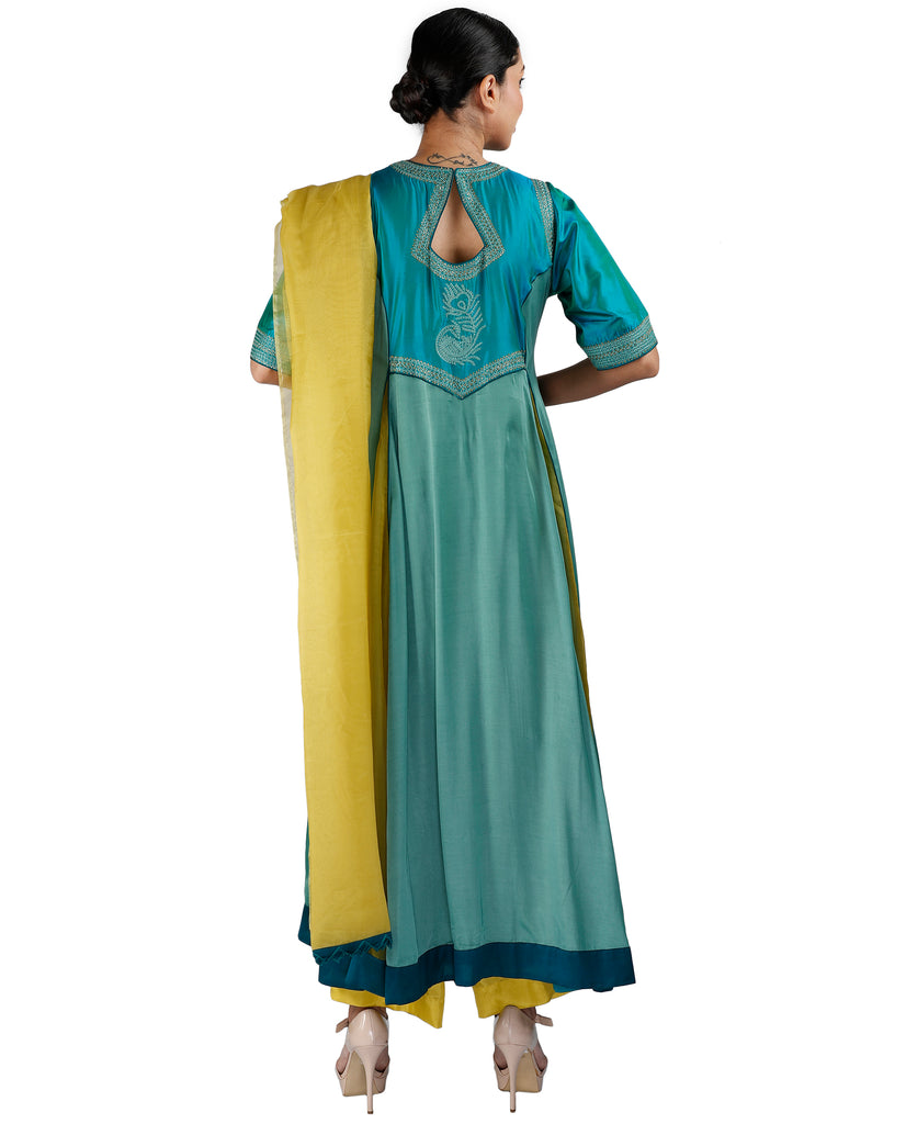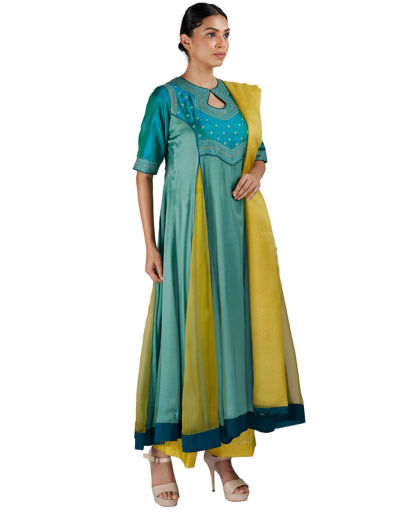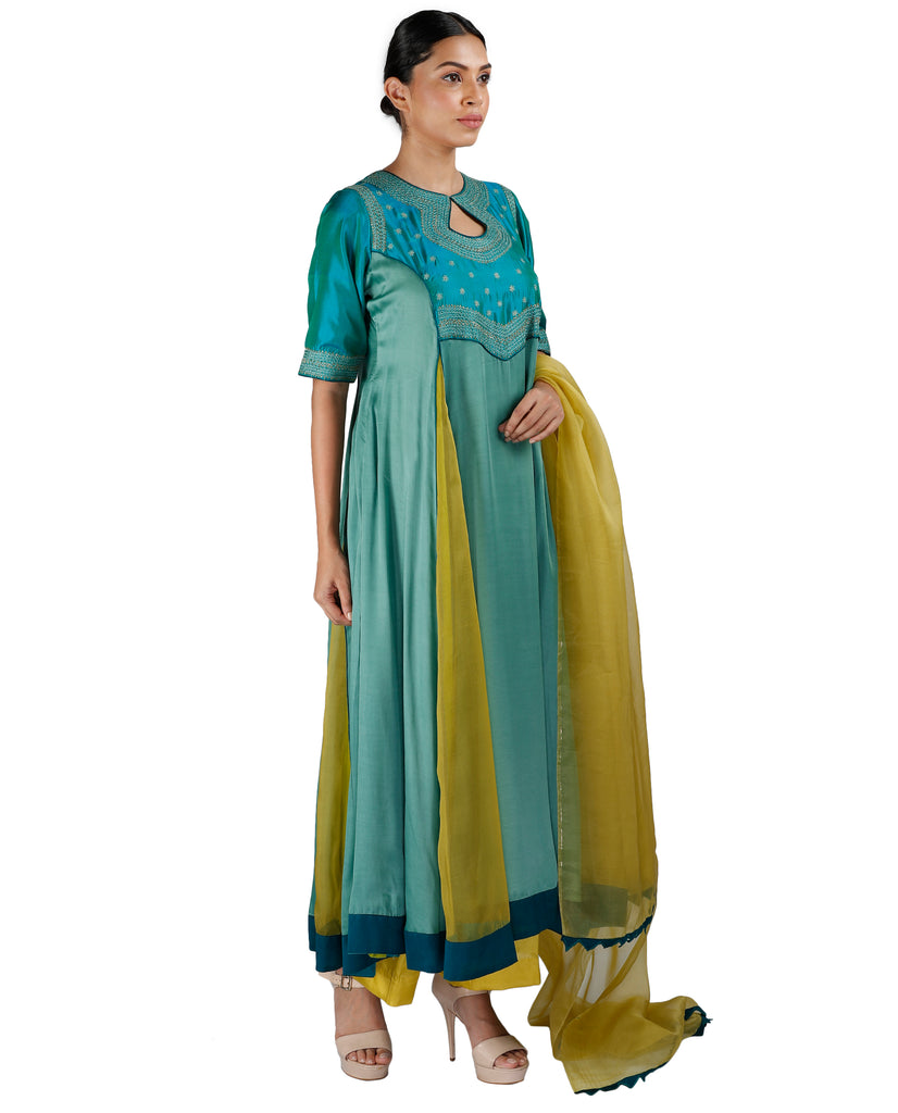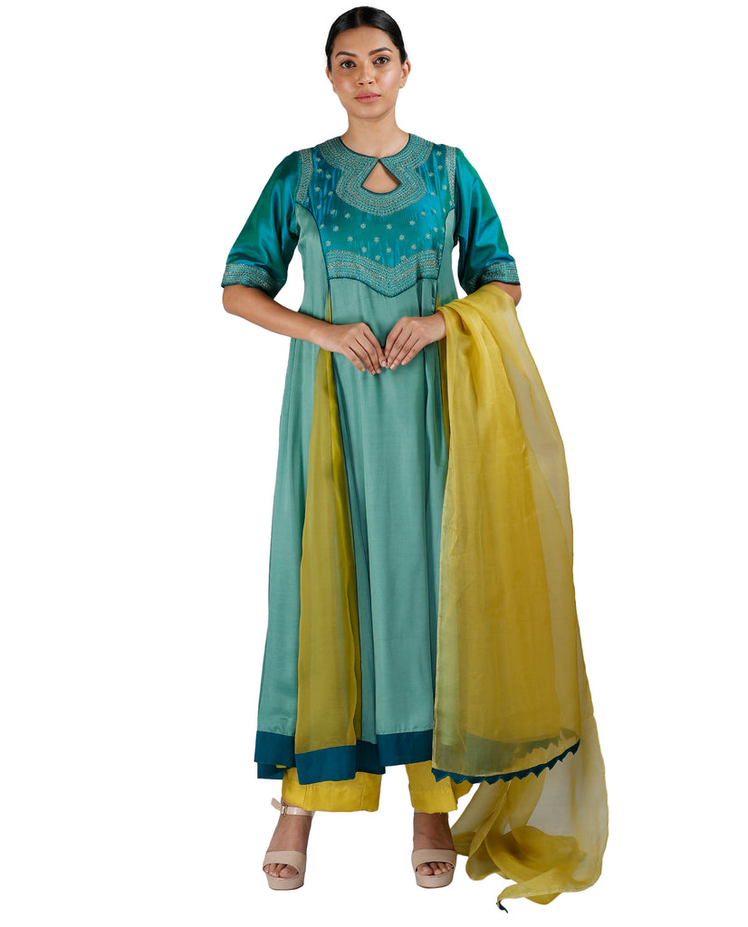 This elegant blue coloured sleeved flared kurta crafted in Organza in adorned with intricate thread embroidery on the blue yoke. It comes along with a pair of yellow straight fit pants. It is paired with a yellow organza dupatta with a border detailing.
