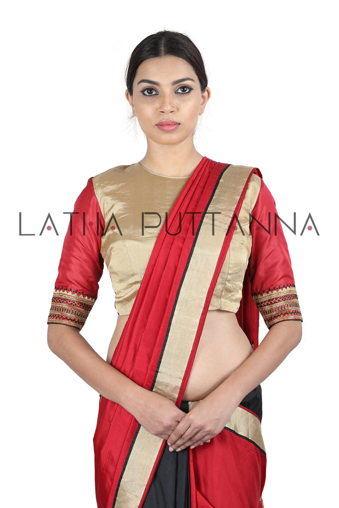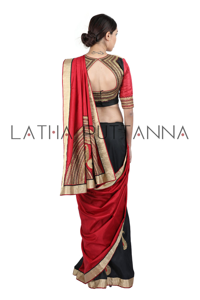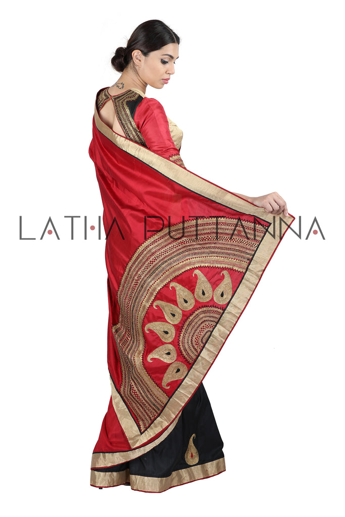 A half and half silk saree in black and chilli red colours. This saree has a dramatic half moon on the pallu and paisleys strewn on the body. With tissue in the front and beaten gold embroidery on silk sleeve and back is a perfect complement.