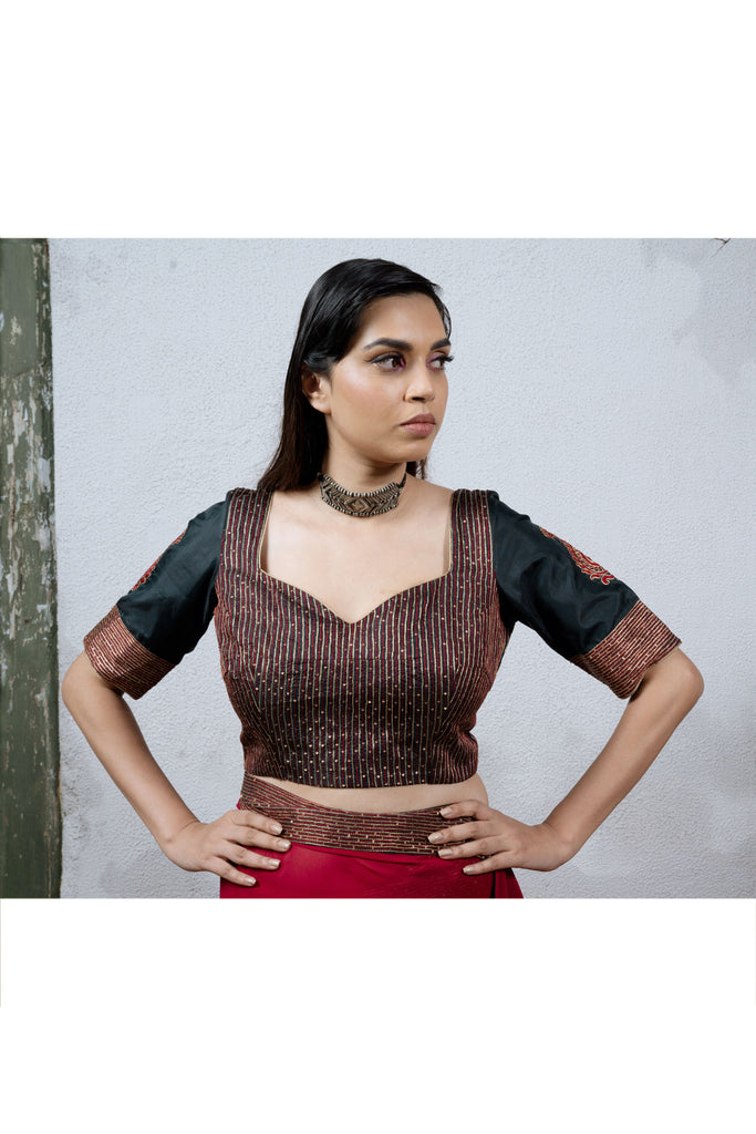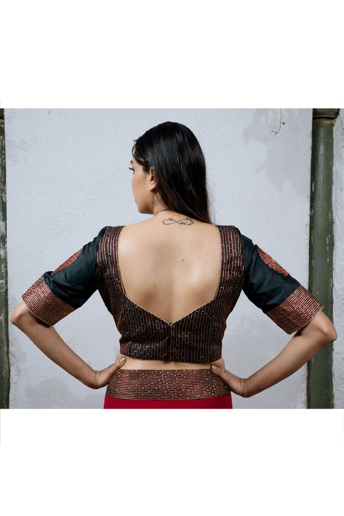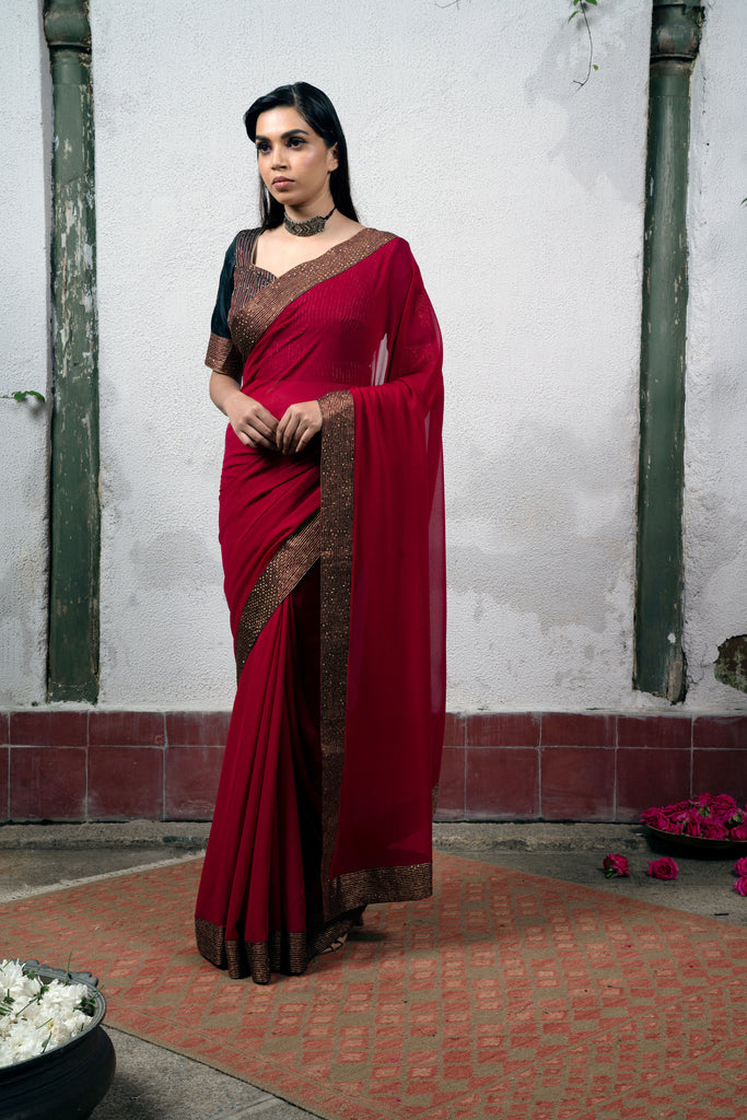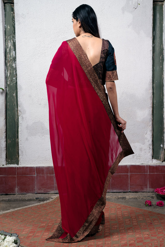 Stay warm, festive, and fashion forward! Get dolled up this winter by flaunting this luxurious georgette saree in red and gold thread work and sequins embroidered border. Complemented with silk blouse with similar embroidery on the front and back. That's t all, the sleeves too have been adorned with mango motifs!