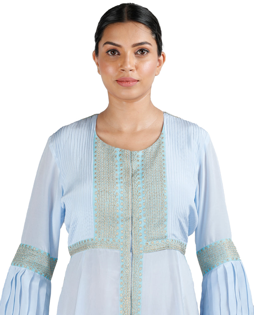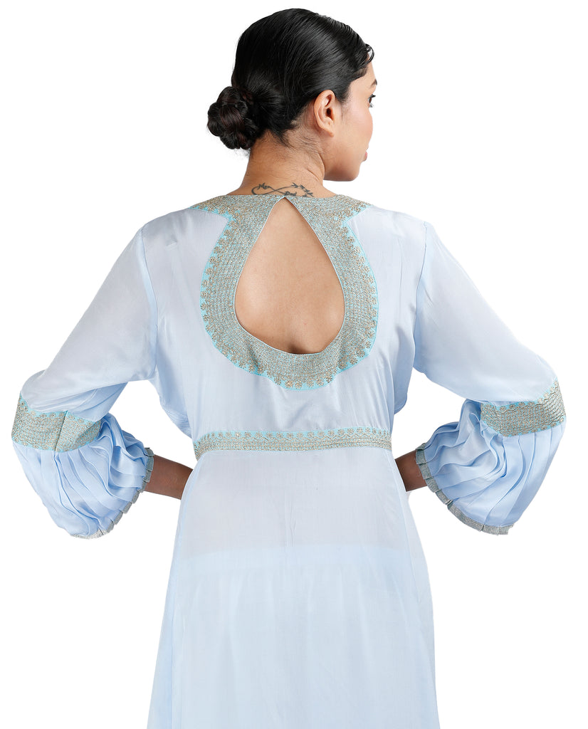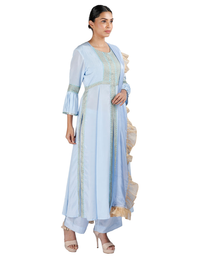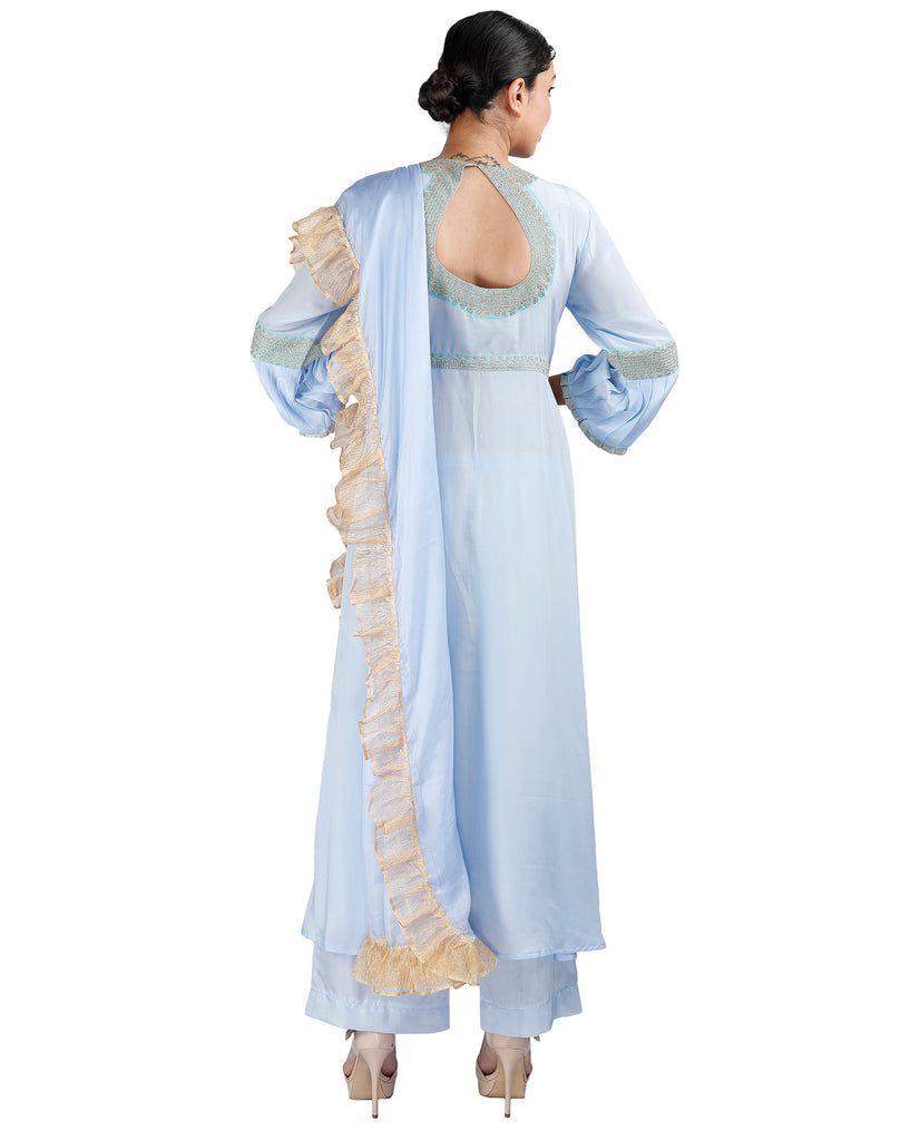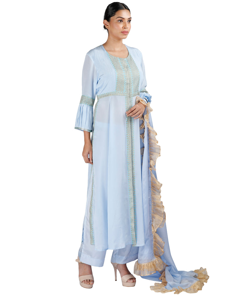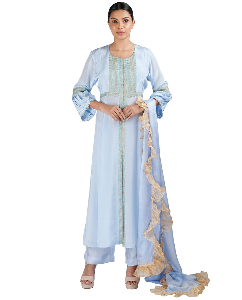 Want to turn heads wherever you go? Now you can look like a true vision in lite blue with this luxurious soft silk kurta adorned with intricate gold embroidery with gold tissue ruffeled dupatta and matching crop pants!