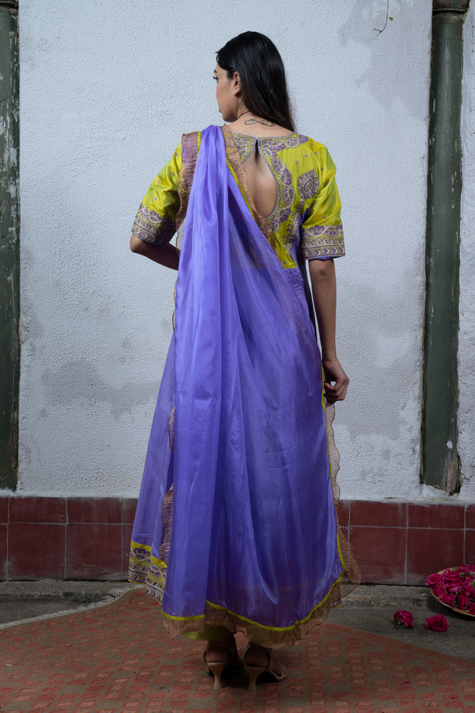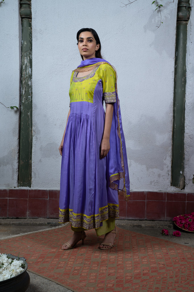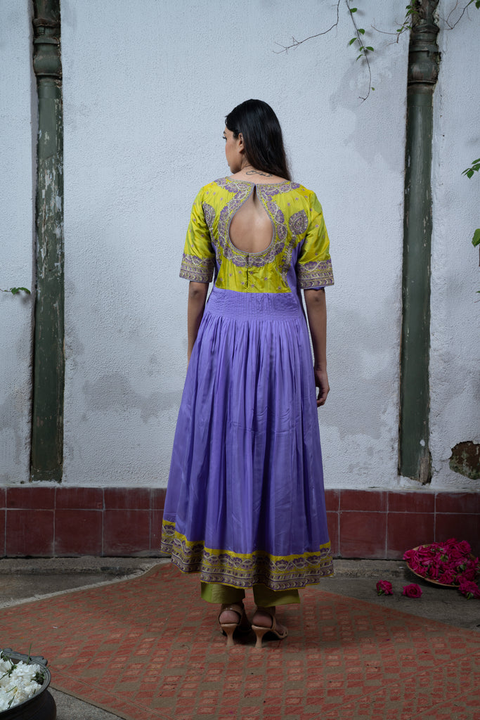 India is a country of fascinating art forms – be it music, dance, or literature. And Latha Puttanna does t shy away from celebrating these. The Mysore range of anarkalis, styled in the eternally classic combination of green and blue, boasts the inimitable motif of a dancing girl on the back and ruffled dupatta. Made in soft silk with gold-beaten work and adorned with rare embroidery, these creations spin a story – something few creations can attempt to match.