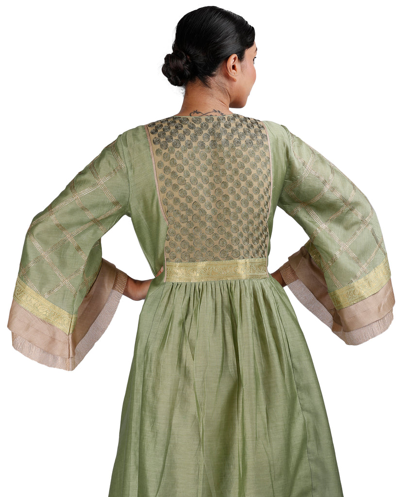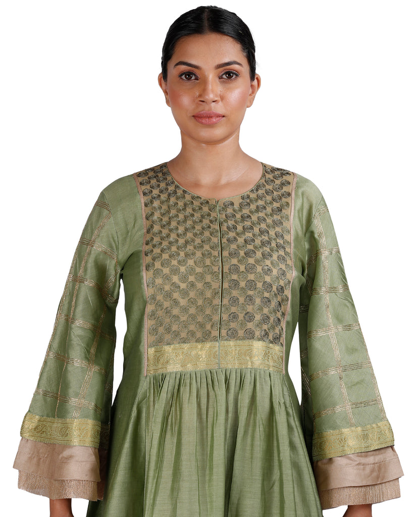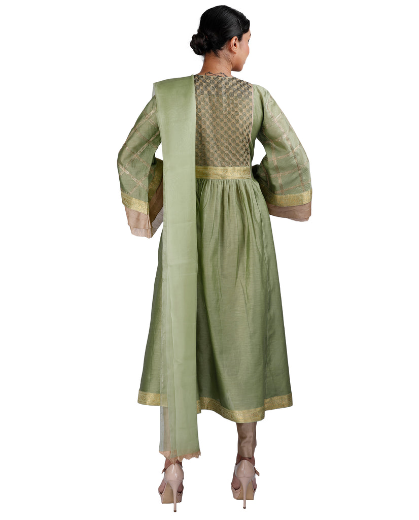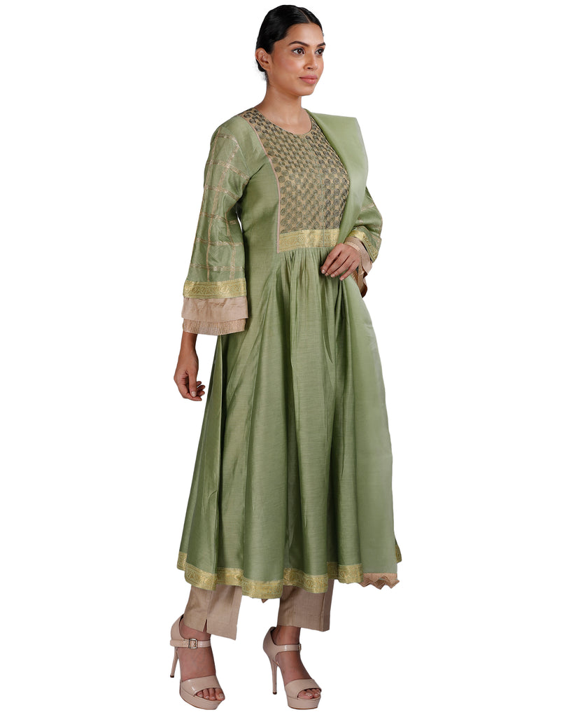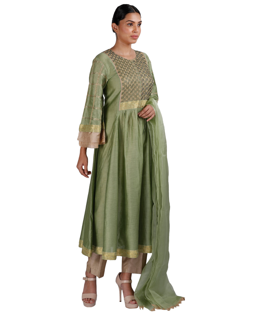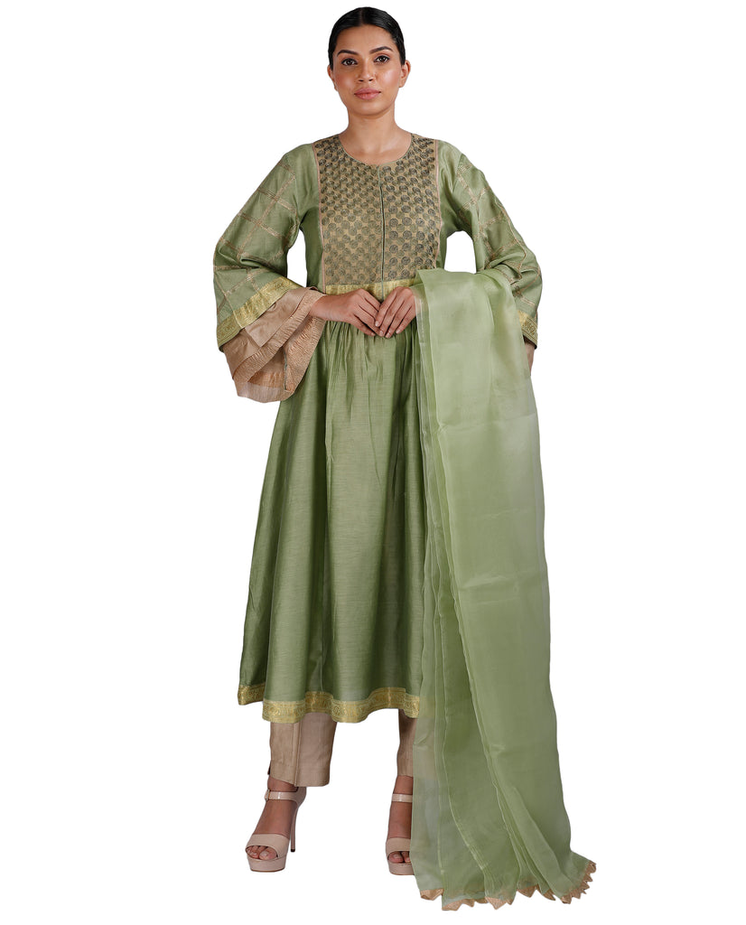 Bring out the inner goddess in you with this stunning fit and flared chanderi kurta in olive green embellished with intricate hand embroidery on yoke and bell-sleeves. Complete the look with a gold straight pants and a organza dupatta in olive green.