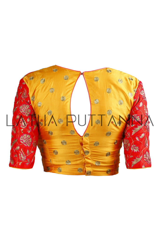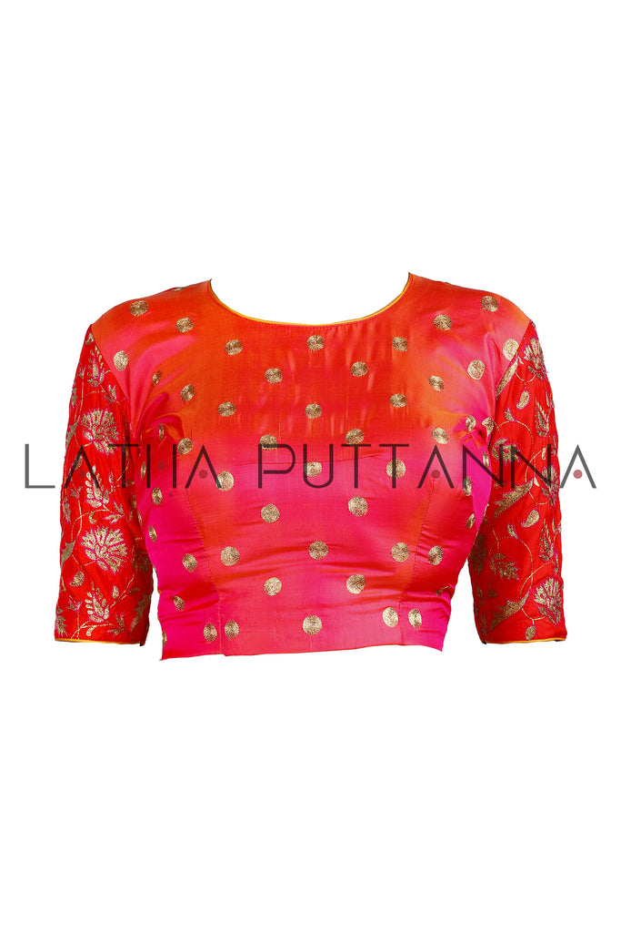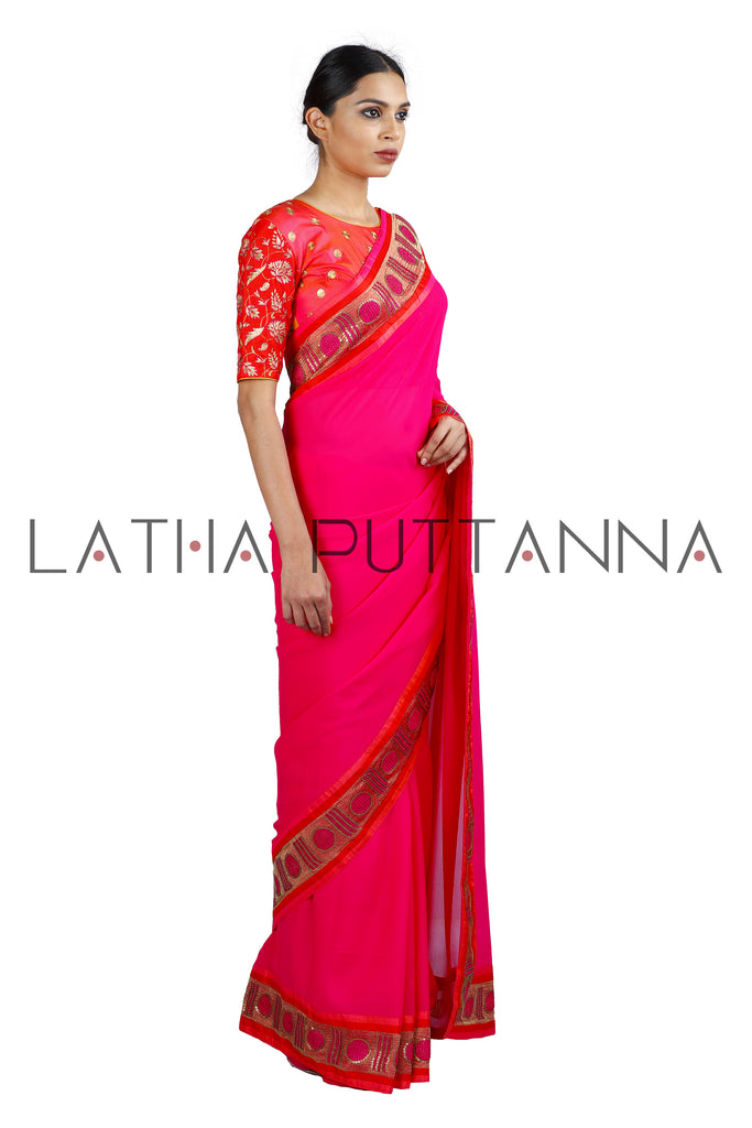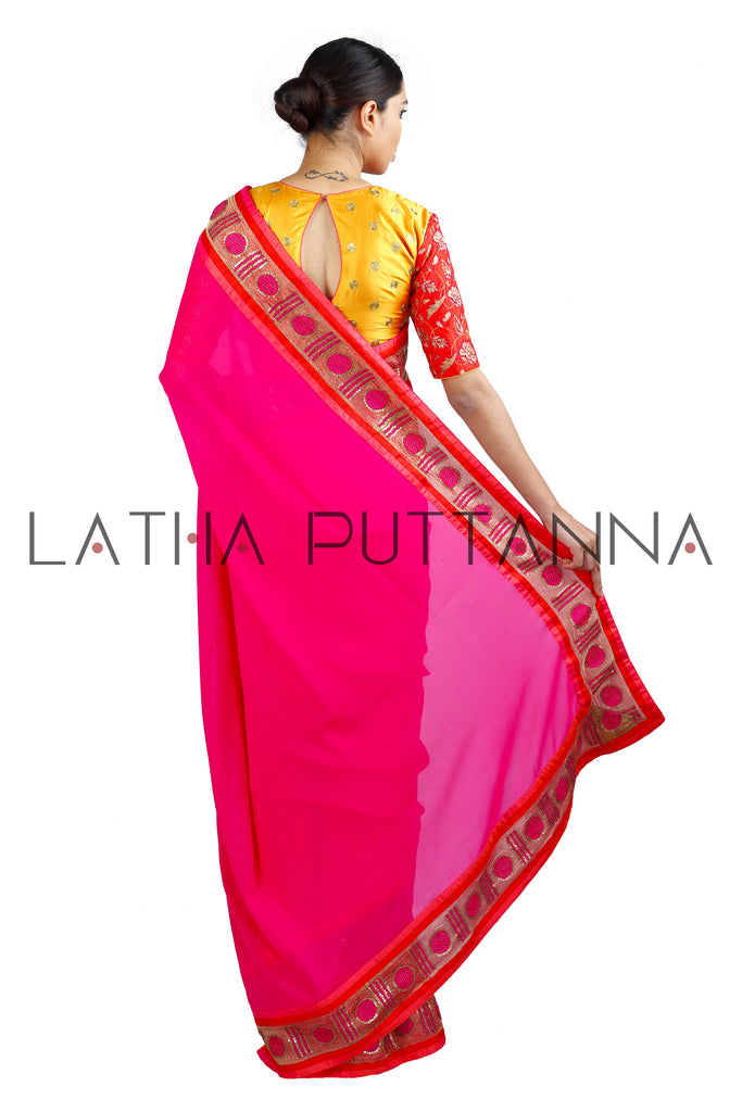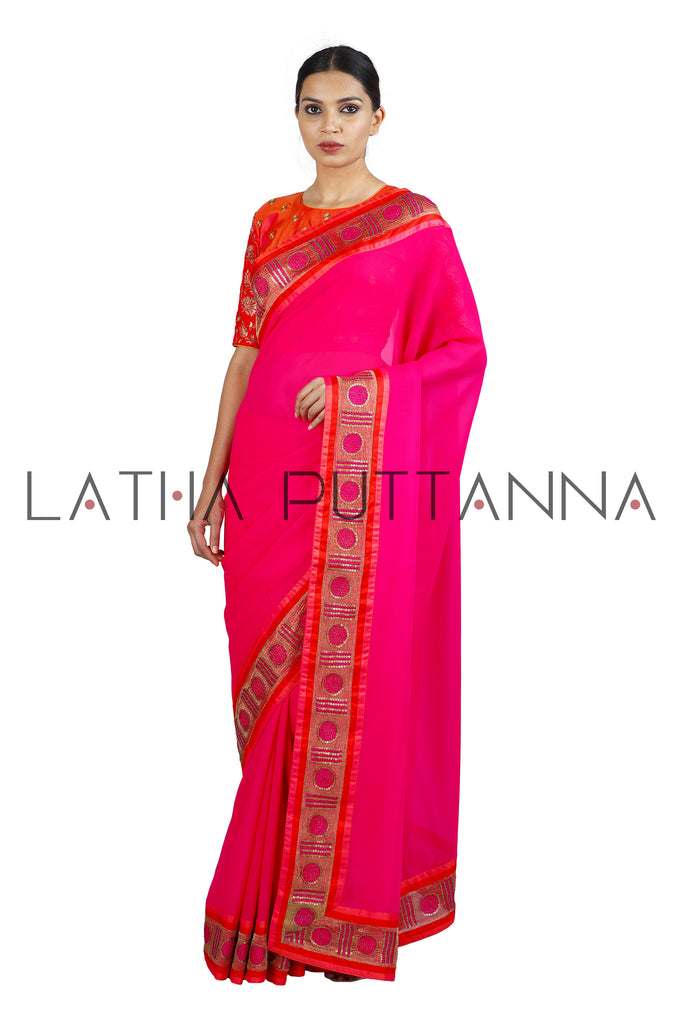 This stunning Rani pink georgette saree is framed by a thread and sequins polka border with red and orange silk patti. Three colour silk blouse with butta and flower balli complements this saree.