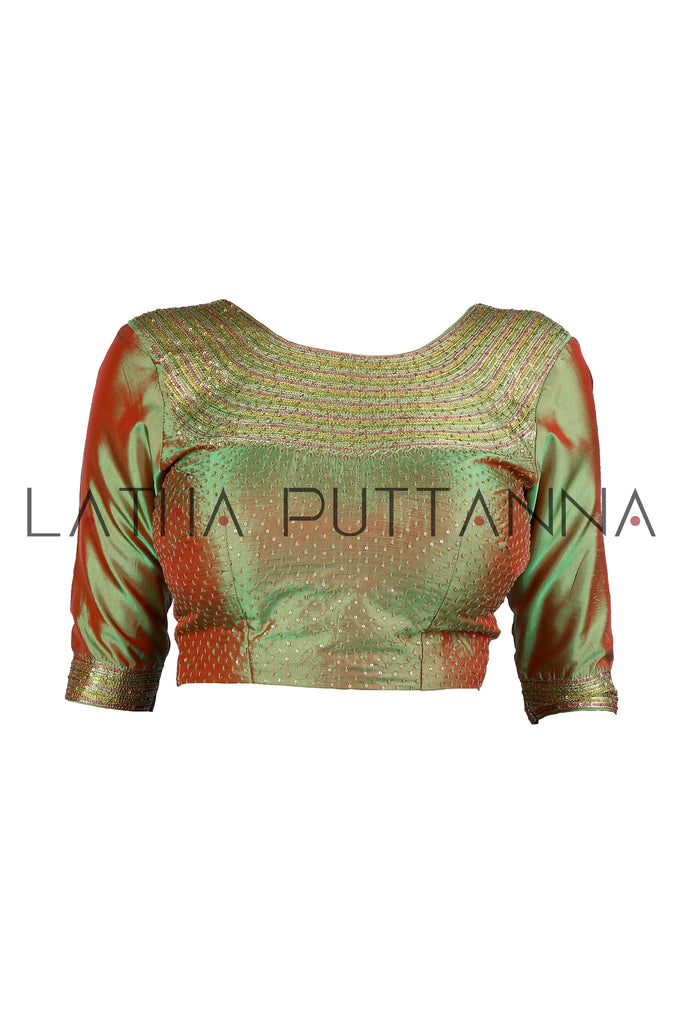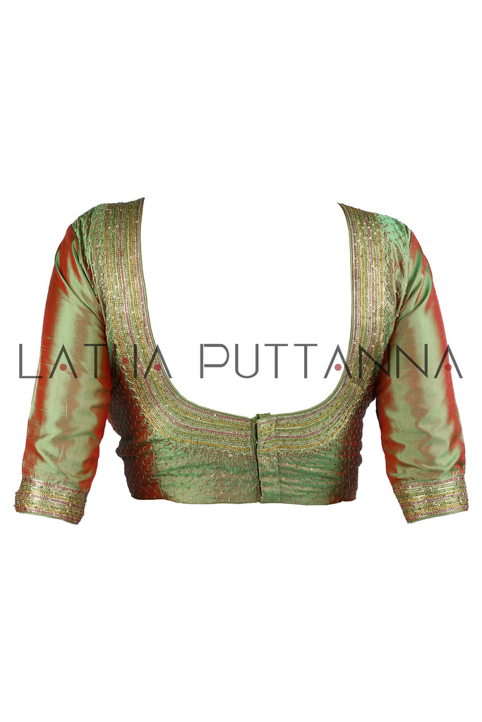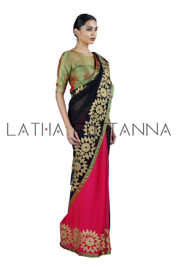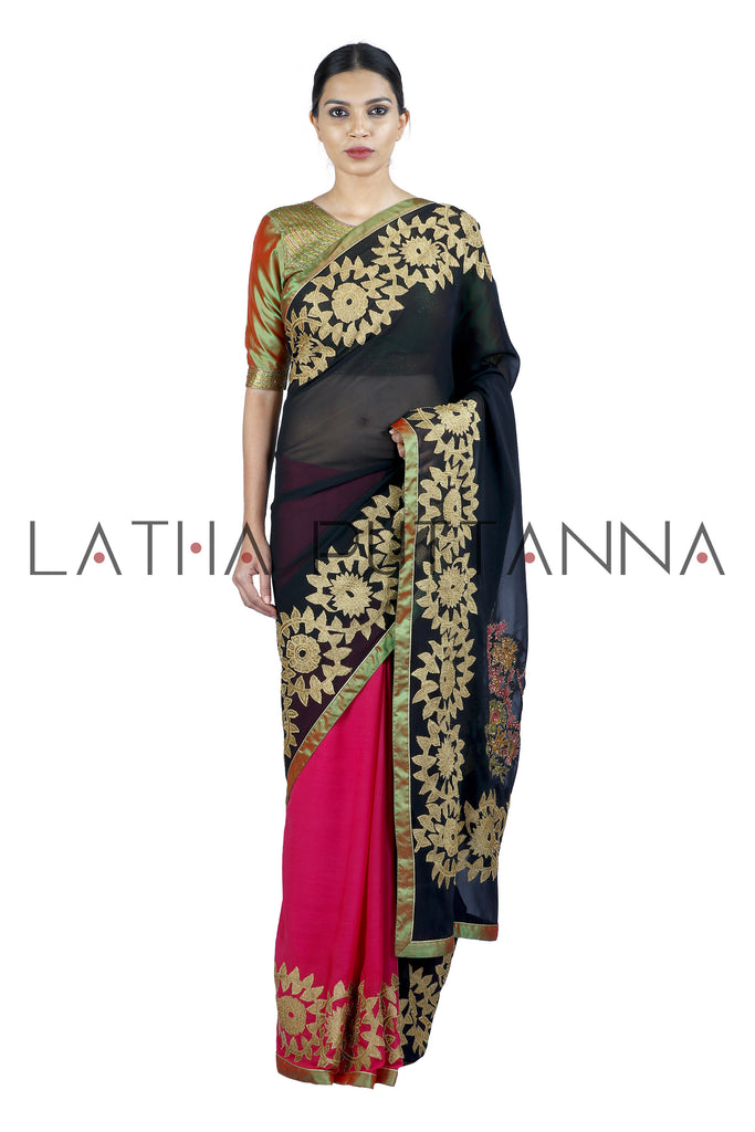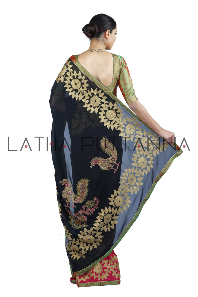 This dramatic saree is a half and half pink and black Georgette saree. The saree has gold tissue appliqué on the border and pallu. Hand embroidered peacocks in thread and sequins adorn the pallu. The two toned silk blouse with intricate thread and sequins embroidery beautifully complements the saree.