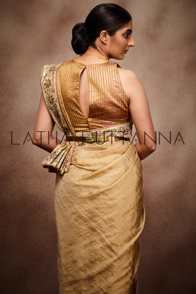 Taking a leaf from royalty, Latha Puttanna has curated a look that is both classic and stunning. Made in gold tissue and embellished with exquisite knotted hand embroidery, this saree is sure to make you feel special. It has been paired with a rich gold sleeveless silk blouse, making it a piece of unmatched grace and beauty.
