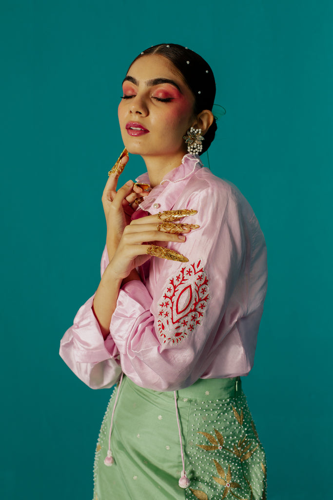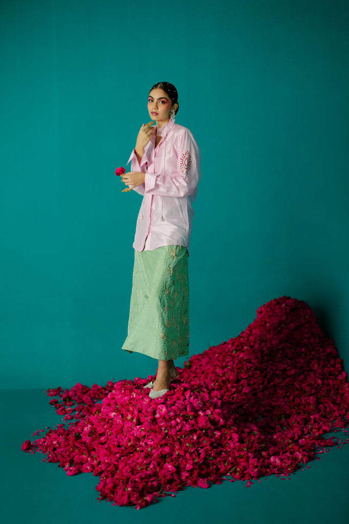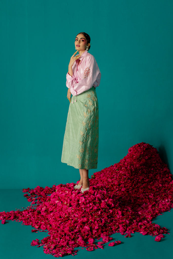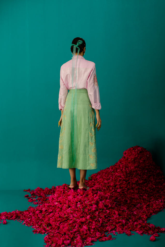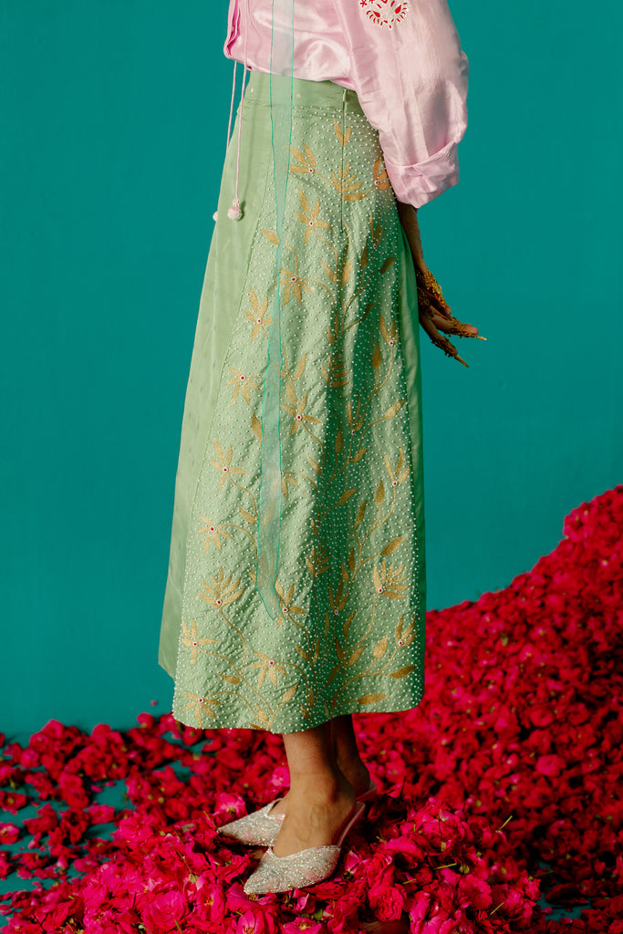 Let your inner fashionista shine with this fiery and unique four-panel skirt made of Karnataka silk with woven stars detailed with floral creaper embroidery motifs adorned with pearl and silk.