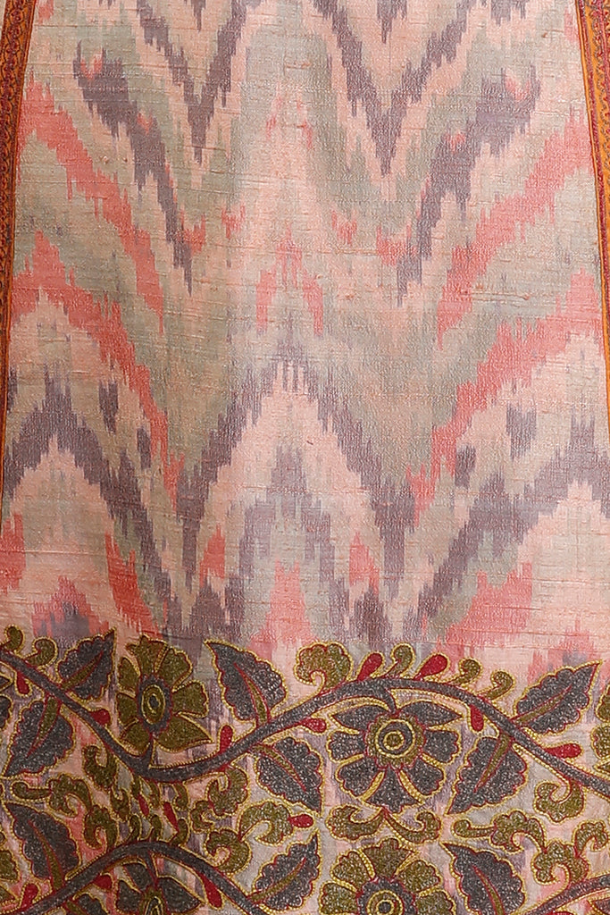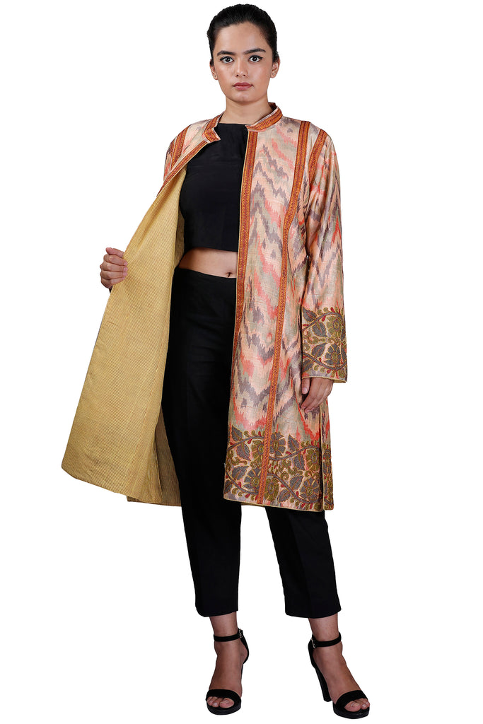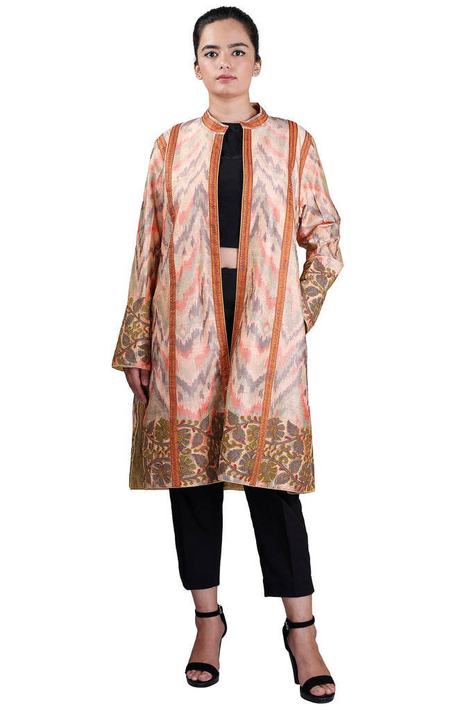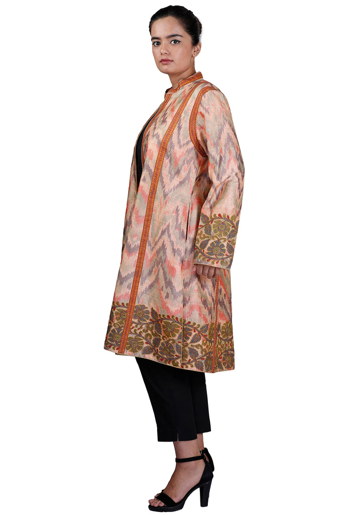 Keep yourself from the winter months with this stylish and head-turning Ikkat jacket in peach, finished with intricate hand-thread embroidery.
