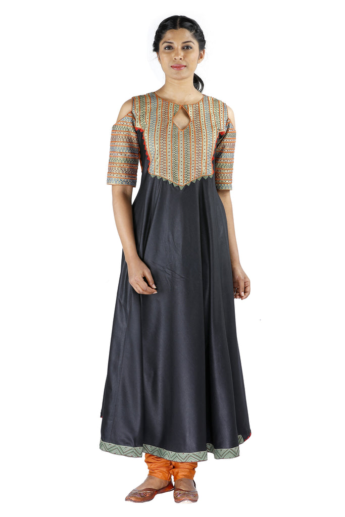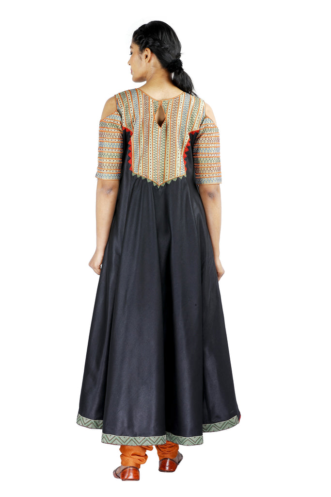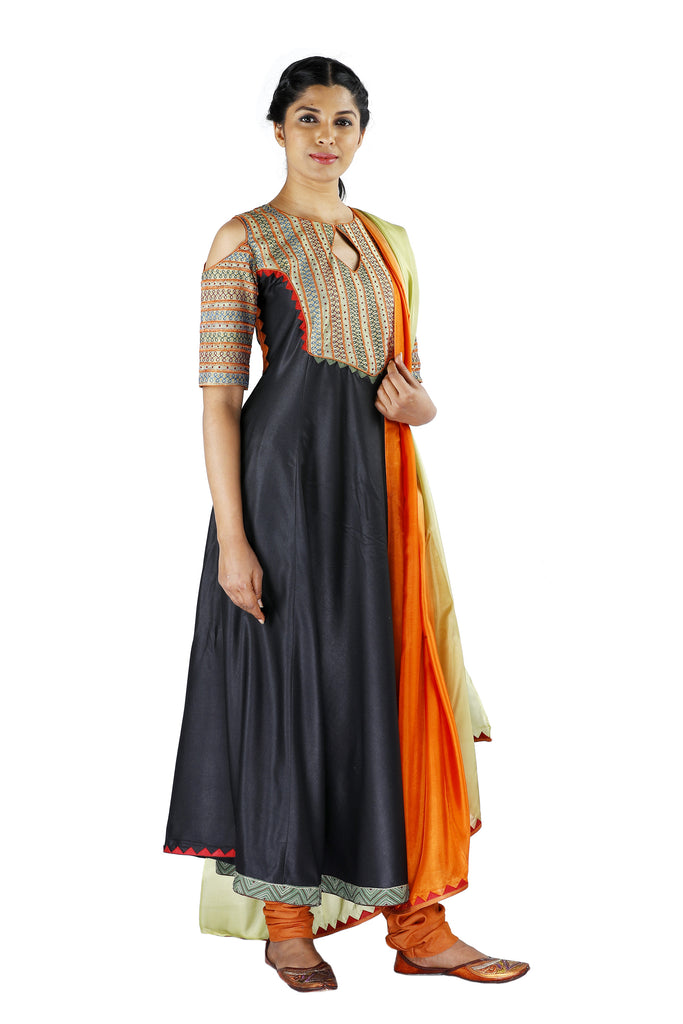 Embody the spirit of fiery embers with this stunning cold-shoulder Tussar anarkali in black, complete with a cut-out neck and delicate hand embroidery – paired with an orange churidaar and multi-colored silk dupatta.
