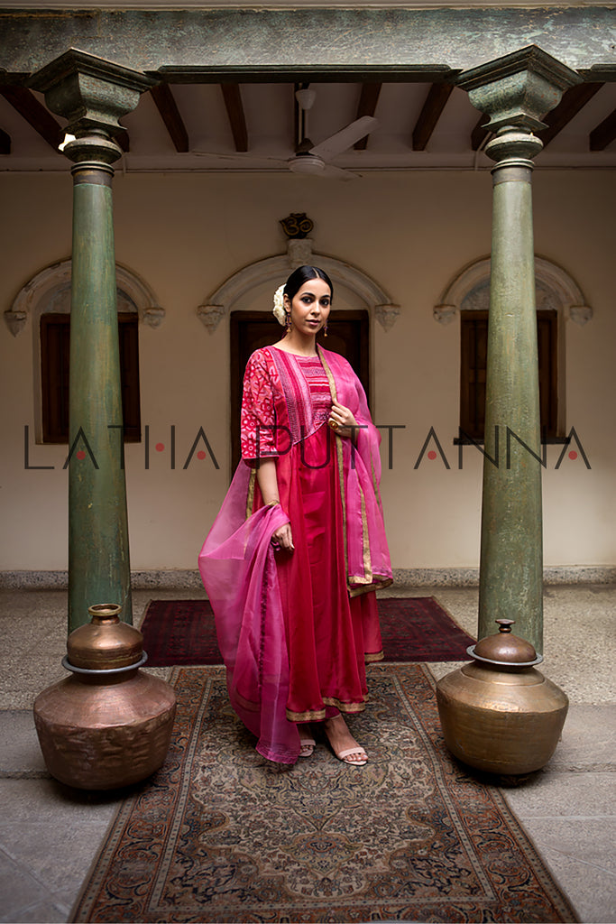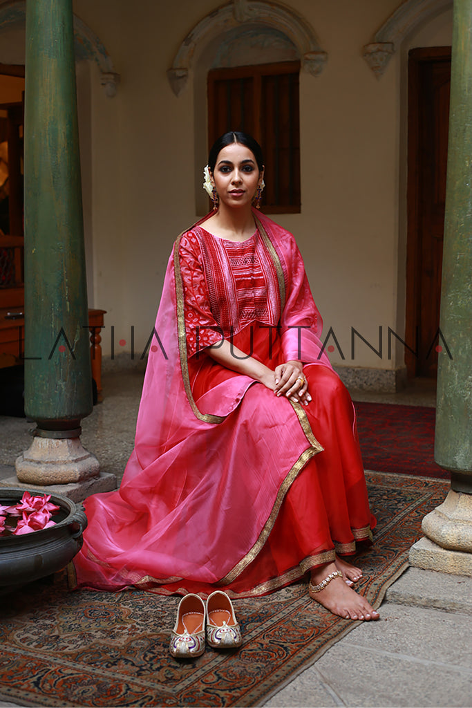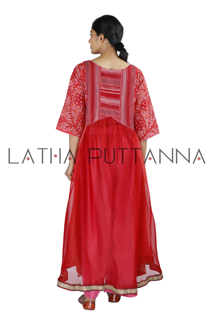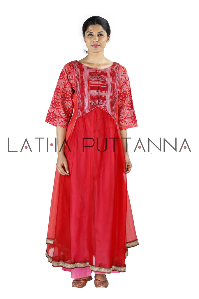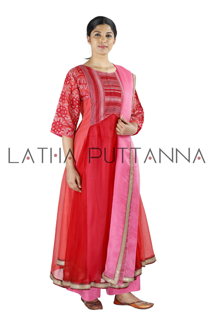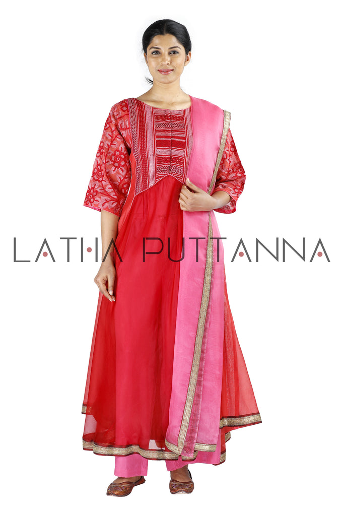 This unique red flared kurtais crafted in Chanderi is embellished with thread embroidery on the yoke and sleeves.The ensemble is paired with pink straight pants and comes with a matching organza dupatta.