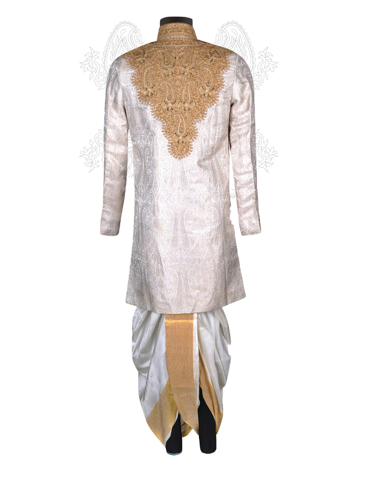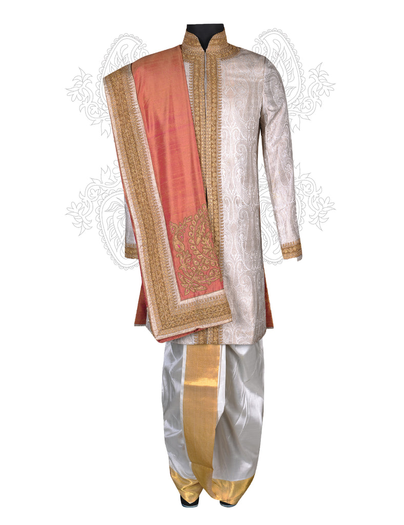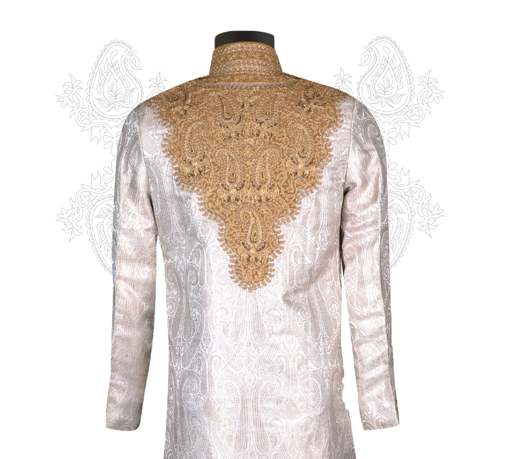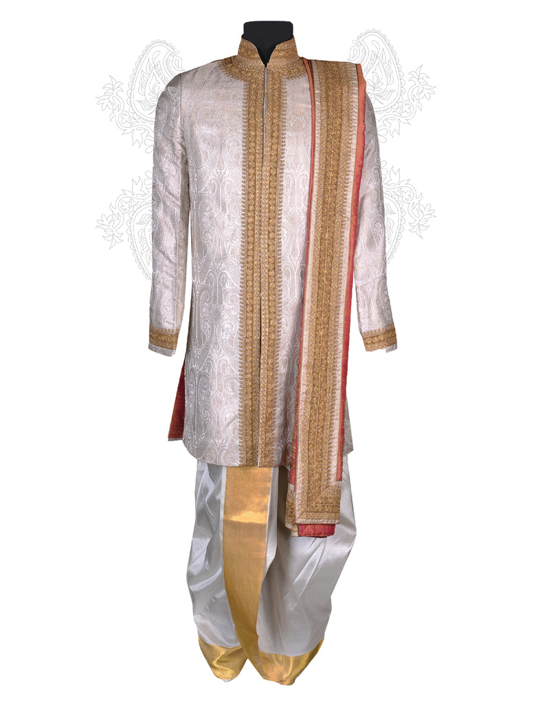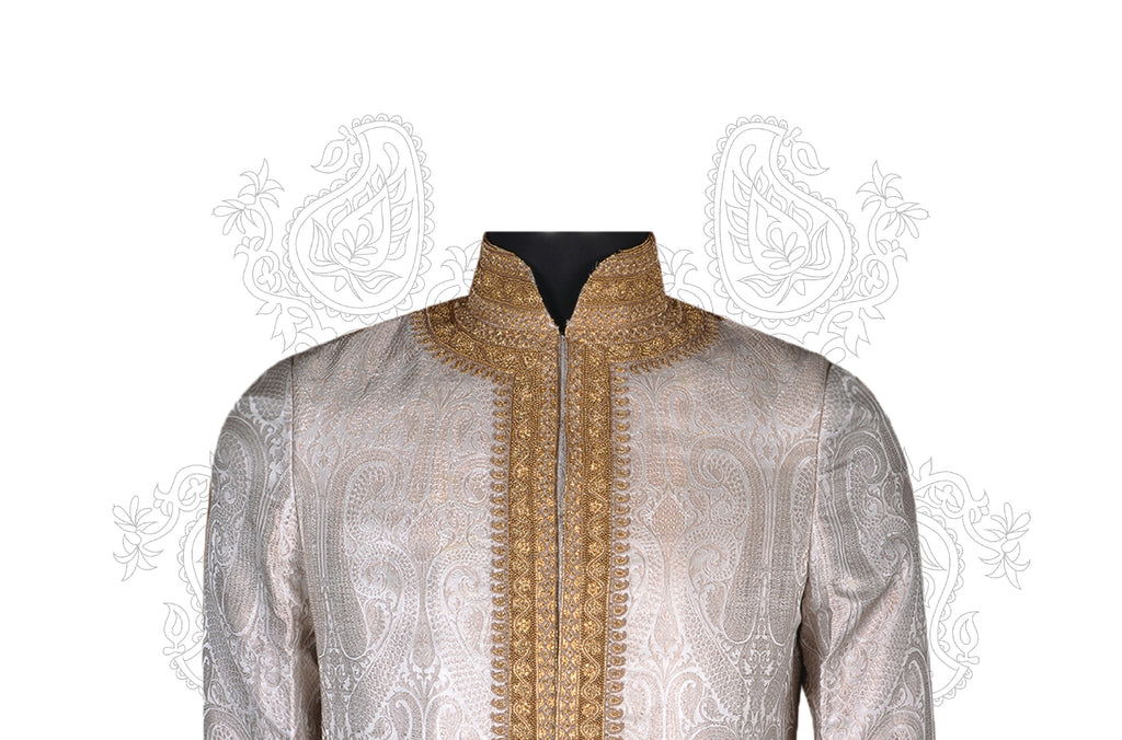 Look every bit the prince on your wedding day with this brocade silk Nehru jacket, adorned with a heavy beaded border around the collar and paisley motif detailing on the back, paired with a contrasting raw silk dupatta detailed with large hand embroidered paisleys and a matching beaded border.