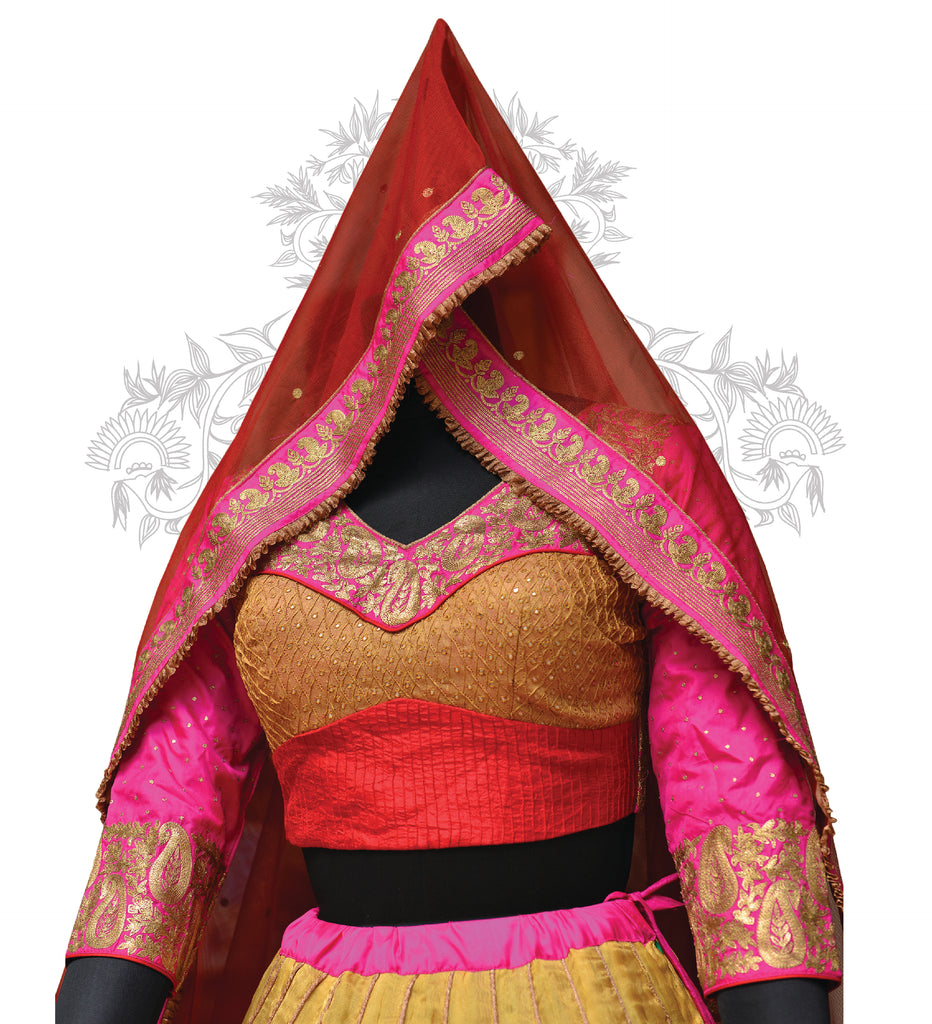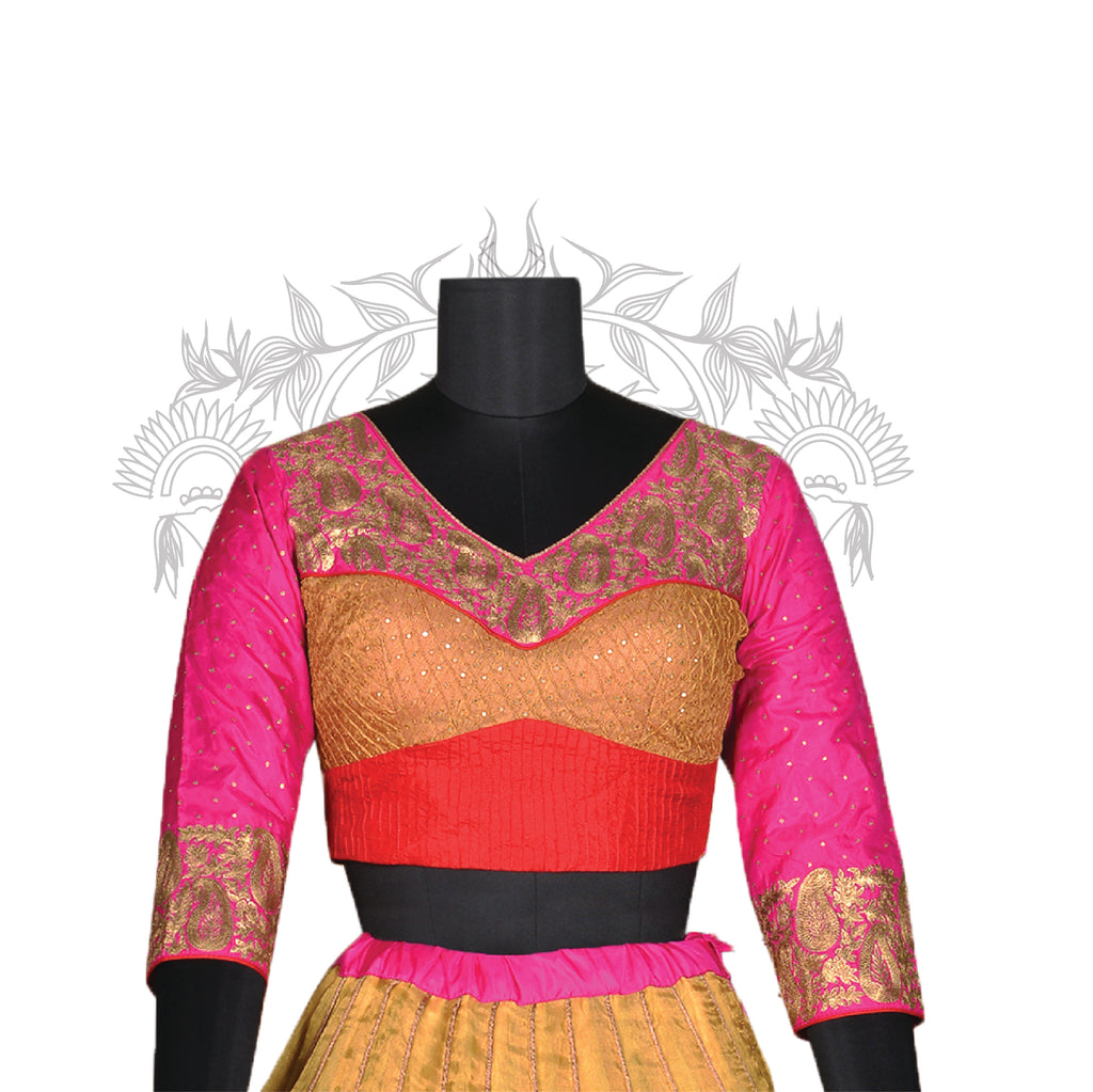 Take your bridal fashion quotient to the next level with this bright yellow and pink lehenga set, complete with a paneled tissue skirt, a silk net dupatta adorned in paisley motifs, a delicate border, and small circular buttas, as well as a multi-toned blouse with paisley motifs and mirror work.