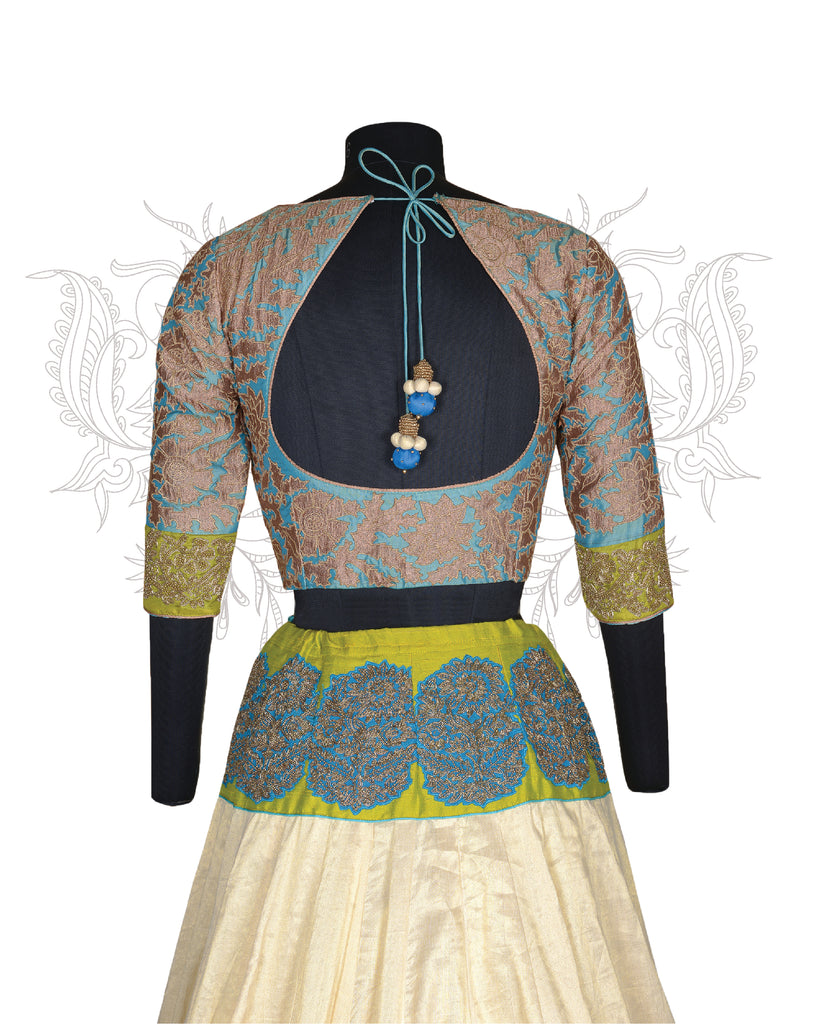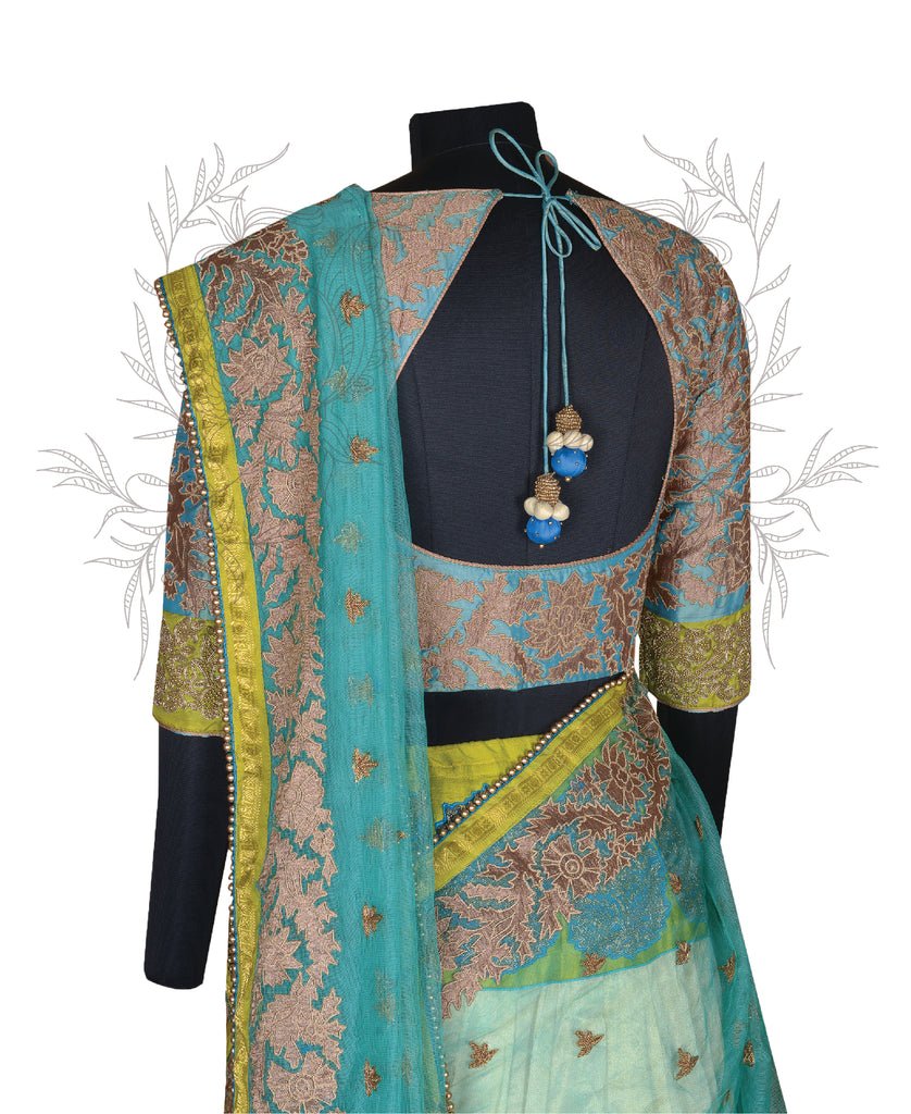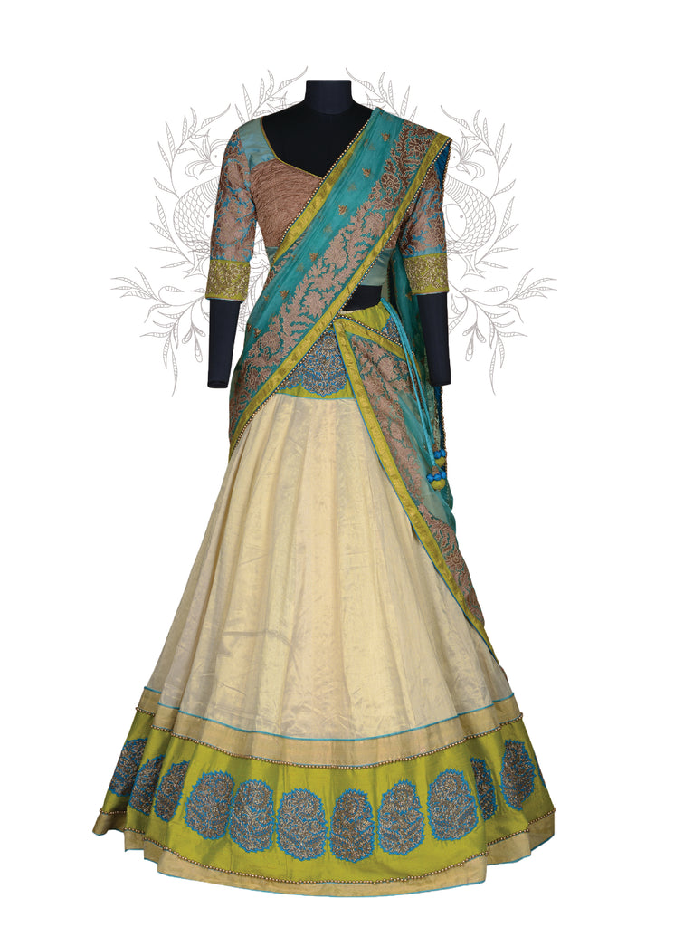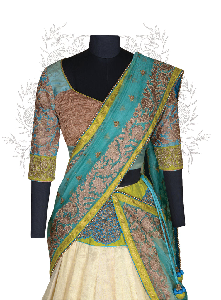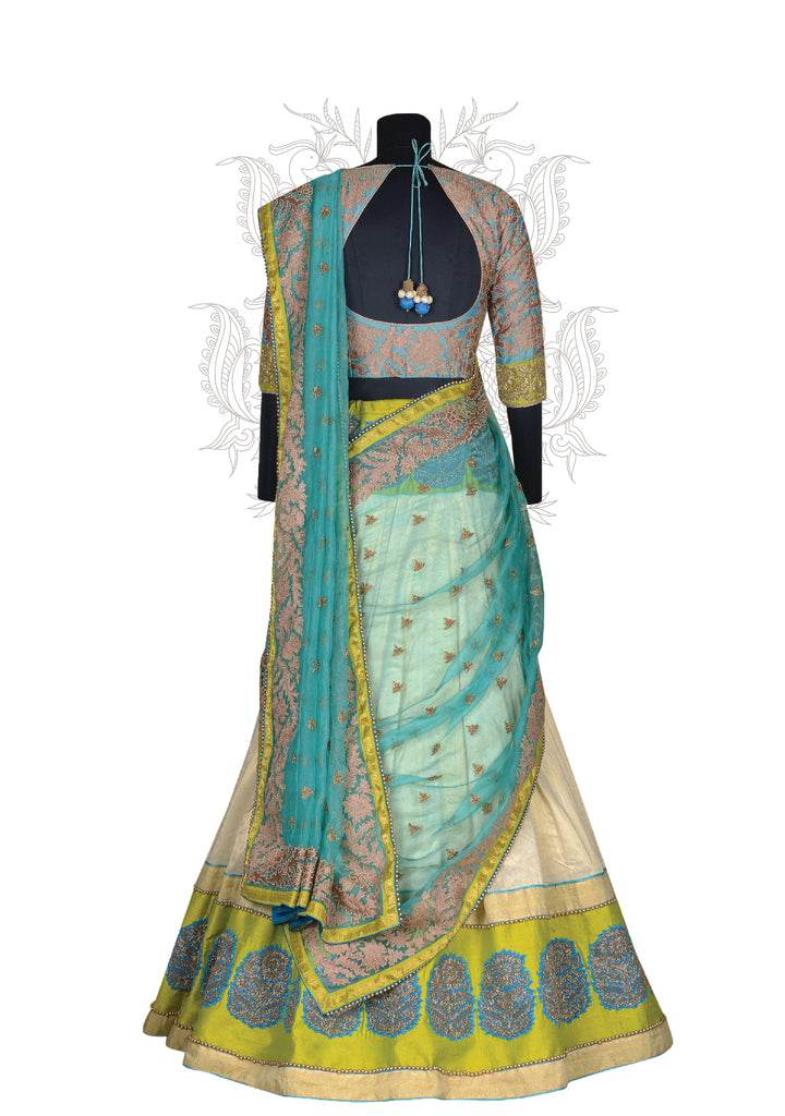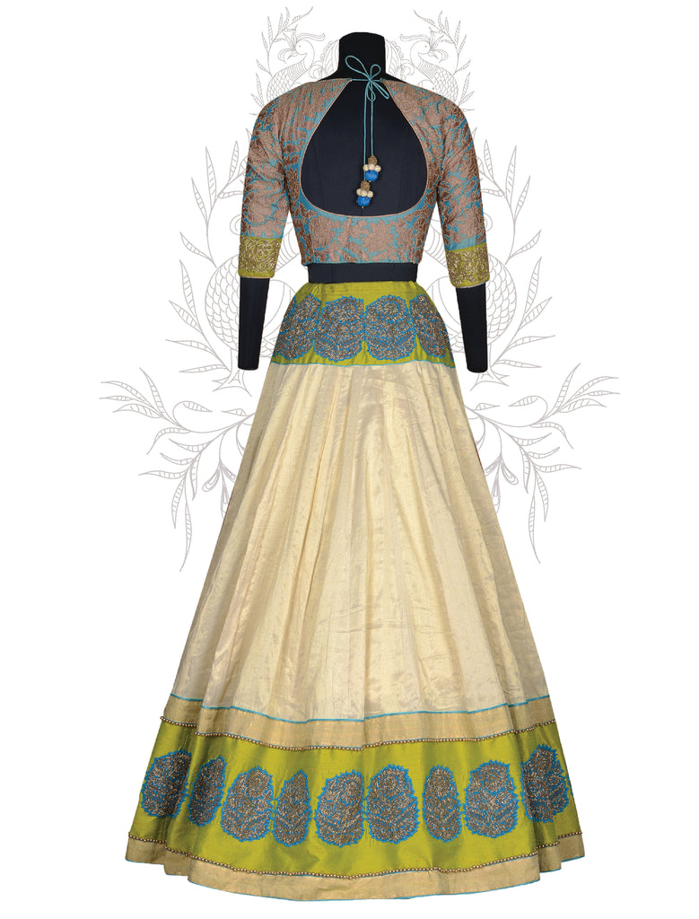 If you're all about contrast, this gorgeous Kerala-inspired ensemble is tailored for you. With a silk tissue and silk skirt adorned with zardozi flowers, a contrasting wide belt and border, this lehenga set isn't complete without this woven silk net dupatta with polkas and a grand applique border of marigold creepers, and a textured silk blouse with applique and marigold creepers in zardozi.