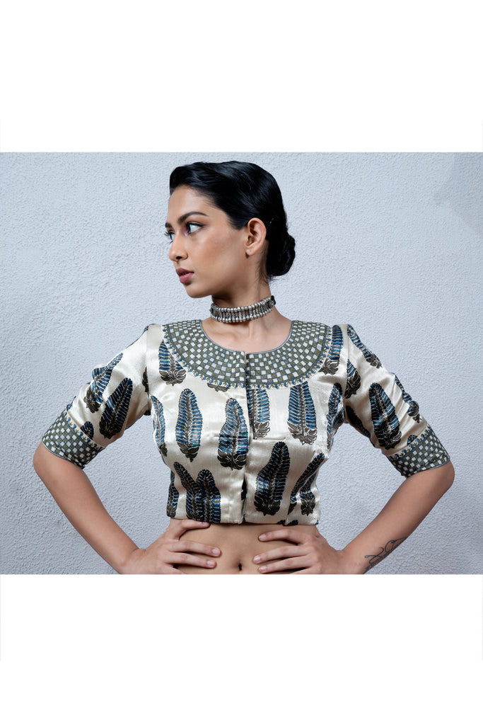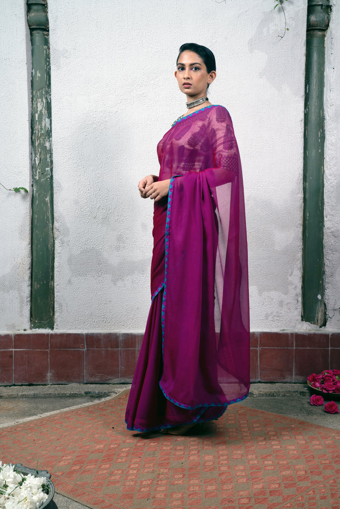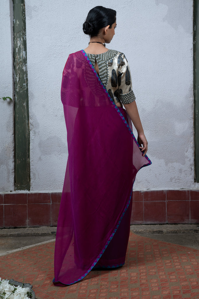 Understated elegance has its own charm – just like this plain magenta chiffon saree with a glittering silver tissue border. Paired with it is a simple ajarak blouse embellished with gold zari and thread embroidery. Keep it simple and breathtaking this festive season!