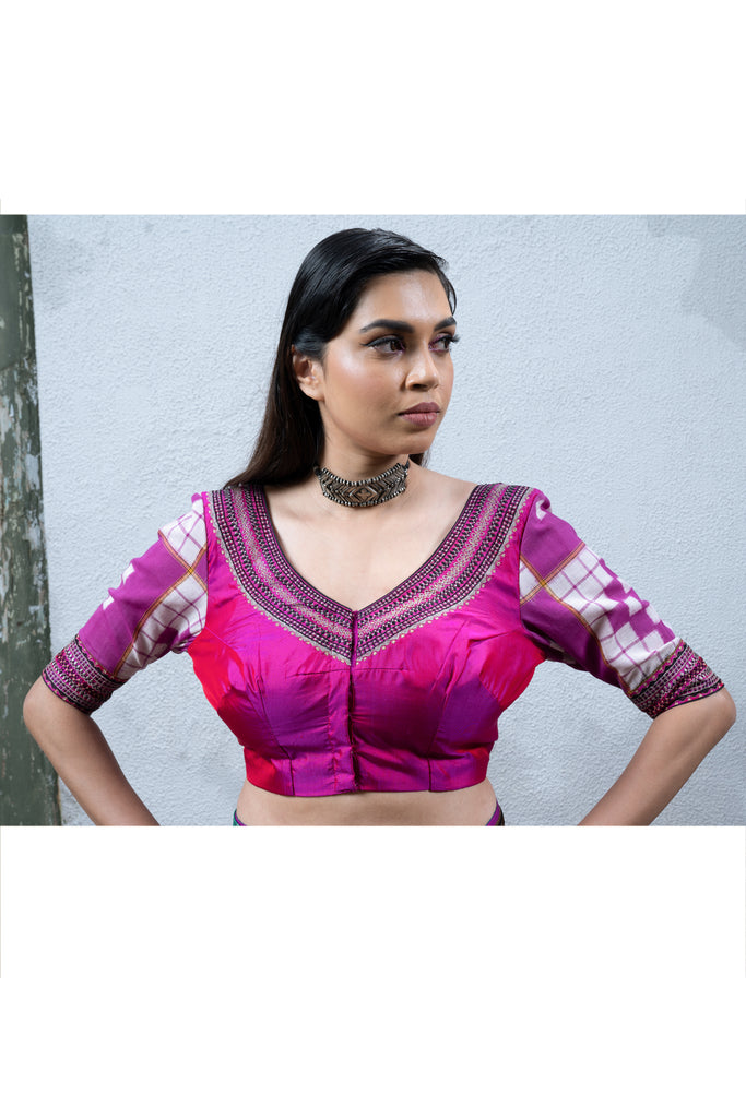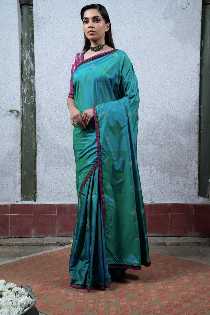 Welcome the winter by looking chic in two-toned silk ! Don this gorgeous sea blue silk saree enhanced with gold hand-block motifs, and paired with an Odisha Ikat blouse with intricate gold zari and thread embroidery.
