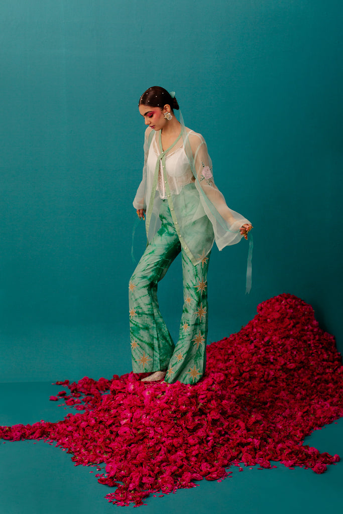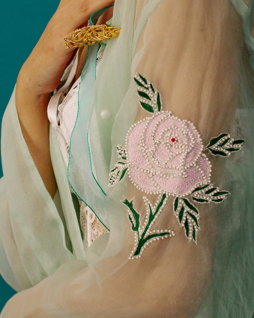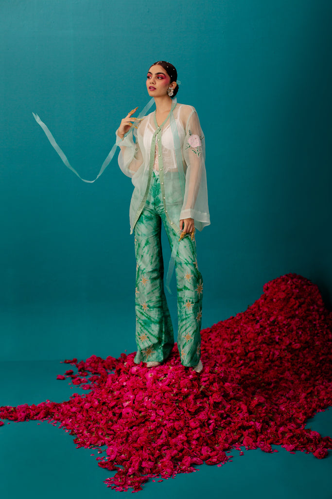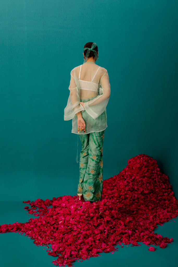 Don't want to go all traditional? Ruffle some feathers the right way with this gorgeous baby pink silk shirt detailed with ruffling at the neckline, a dori, and exquisite zari and thread embroidered motifs on the sleeves.