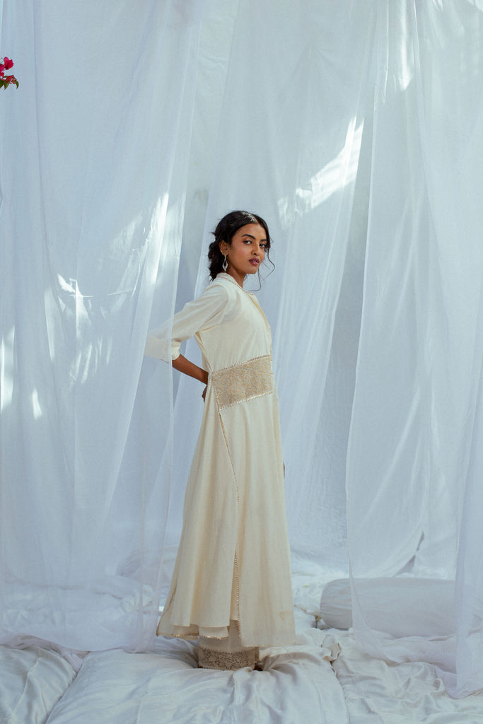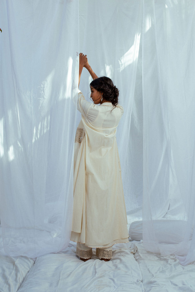 Want to keep yourself cool and covered even when the sun is not? What you need is this hand-woven off-white cotton overcoat with machine embroidery in cream, zari & cutwork, available in both long and short cuts.