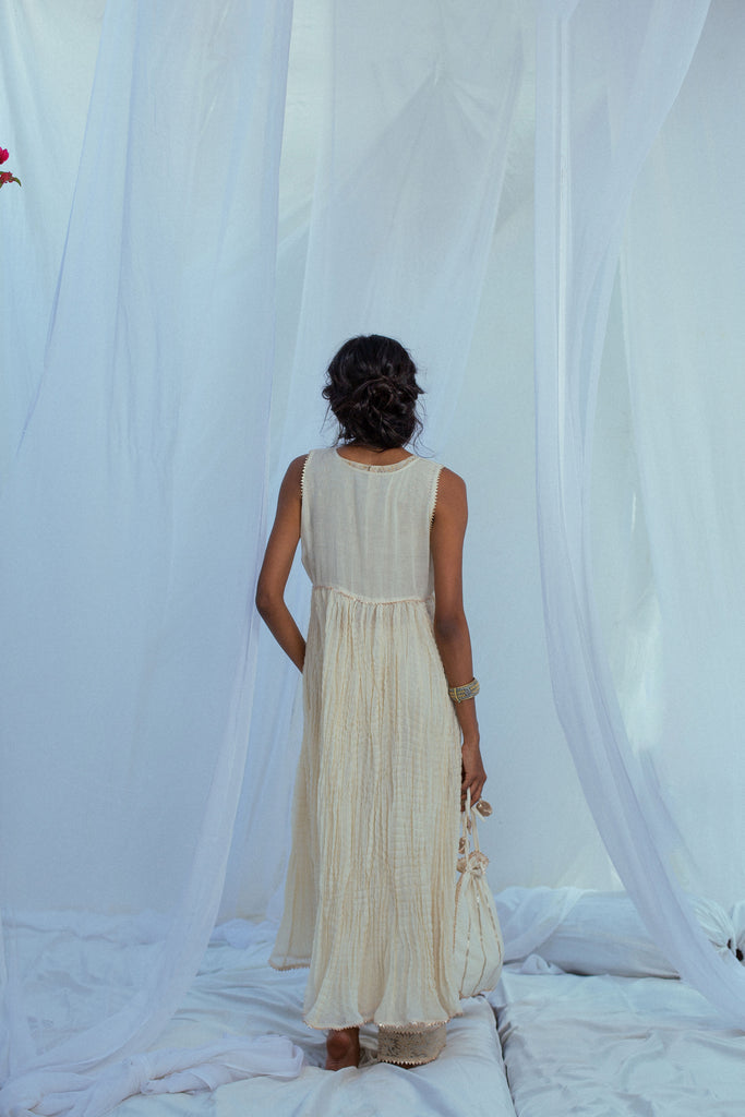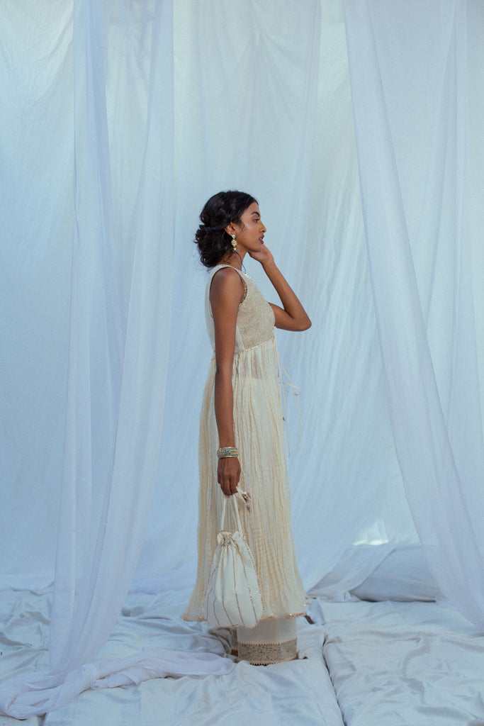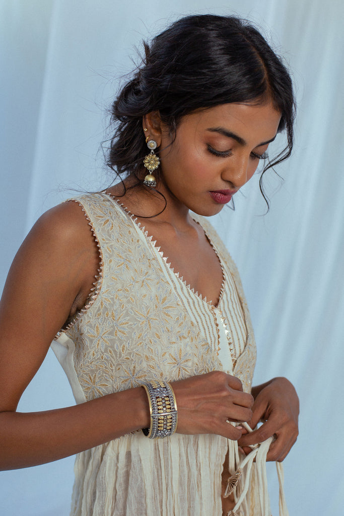 Who said layering is just for winters! Give your outfit a summery flair with this off-white crushed shrug made with hand-woven cotton and embellished with cream outline and silver & gold filling silk thread machine embroidery on the entire upper torso.