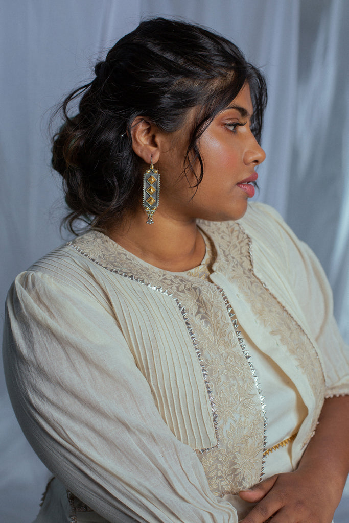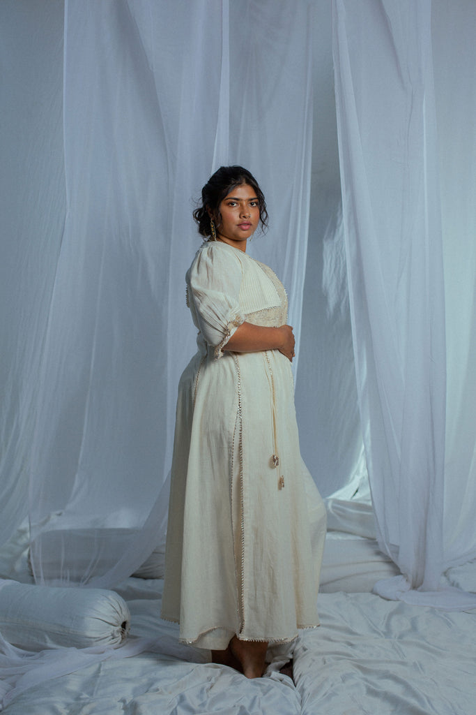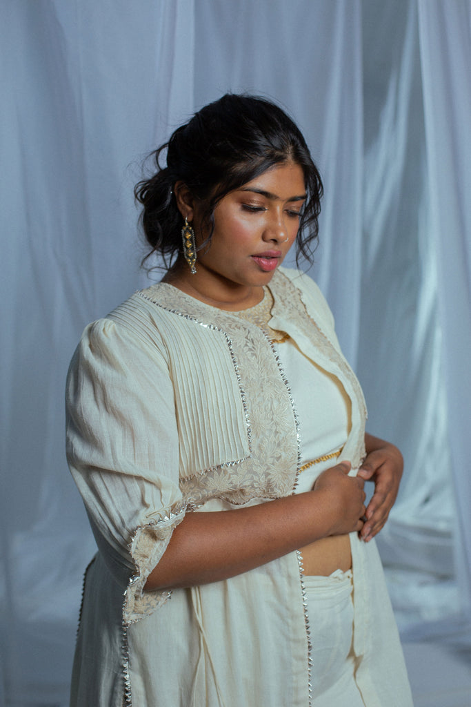 Layering in the summer is all about making smart choices. With this off-white handwoven cotton jacket, embellished with cream colored machine embroidery, you can stay cool and fashionable even under the hottest sun!