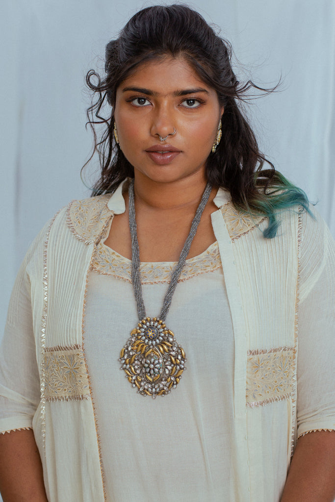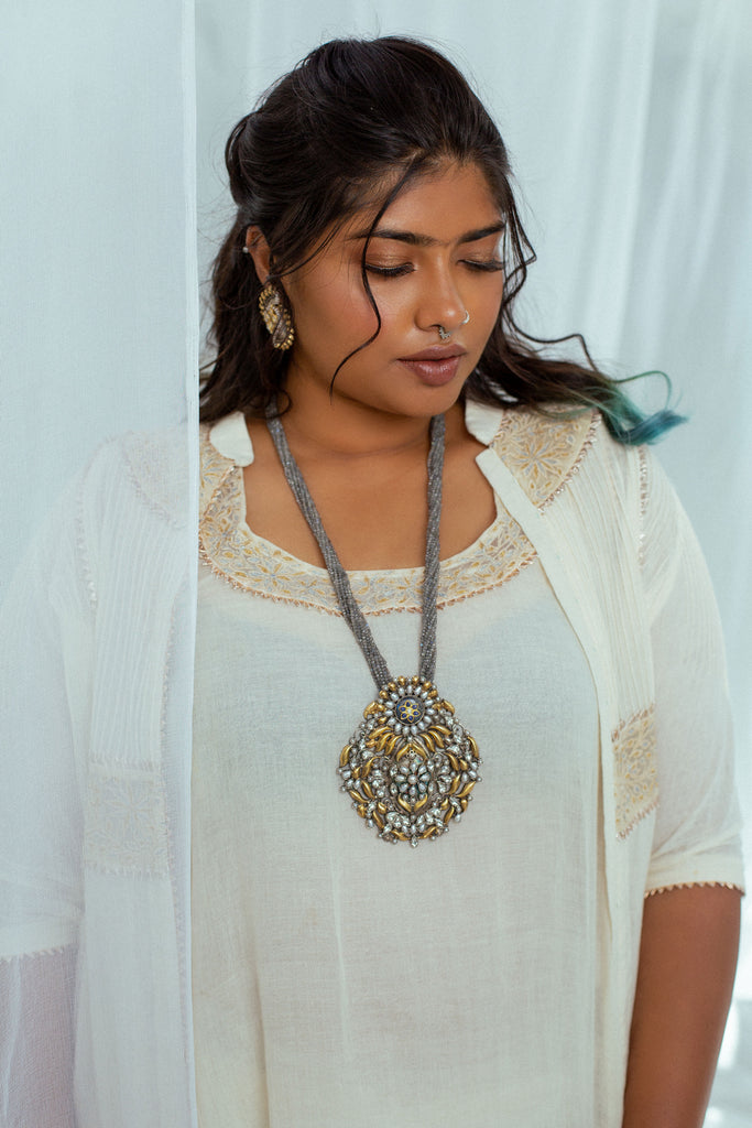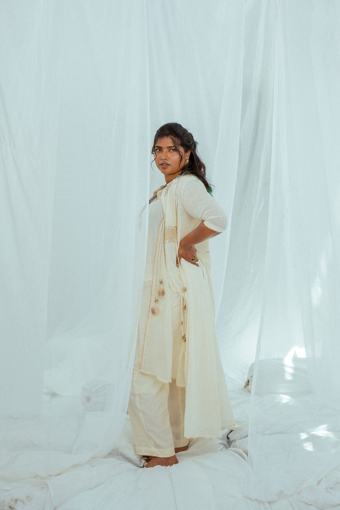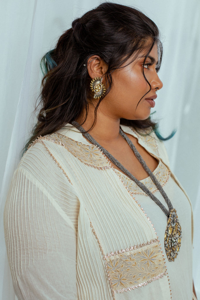 Layering in the summer is all about making smart choices. With this off-white handwoven cotton jacket, embellished with cream and silver-gold machine embroidery, you can stay cool and fashionable even under the hottest sun!