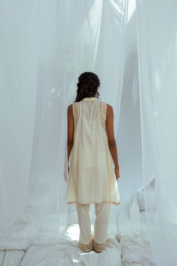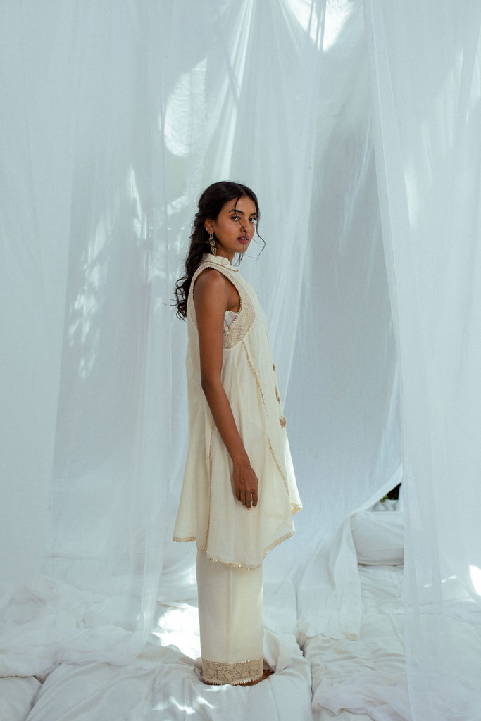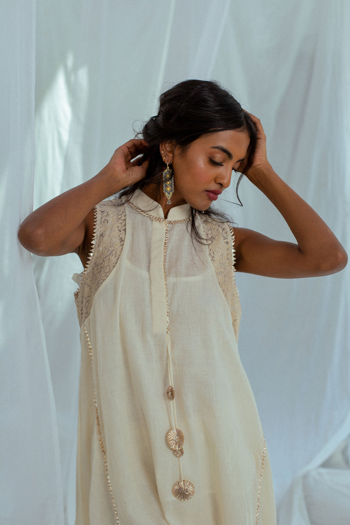 Thinking of elevating your summer wardrobe? Tune in to this gorgeous off-white sleevesless tunic in hand-woven cotton, detailed with cream oultline and filling machine embroidery on the armhole.