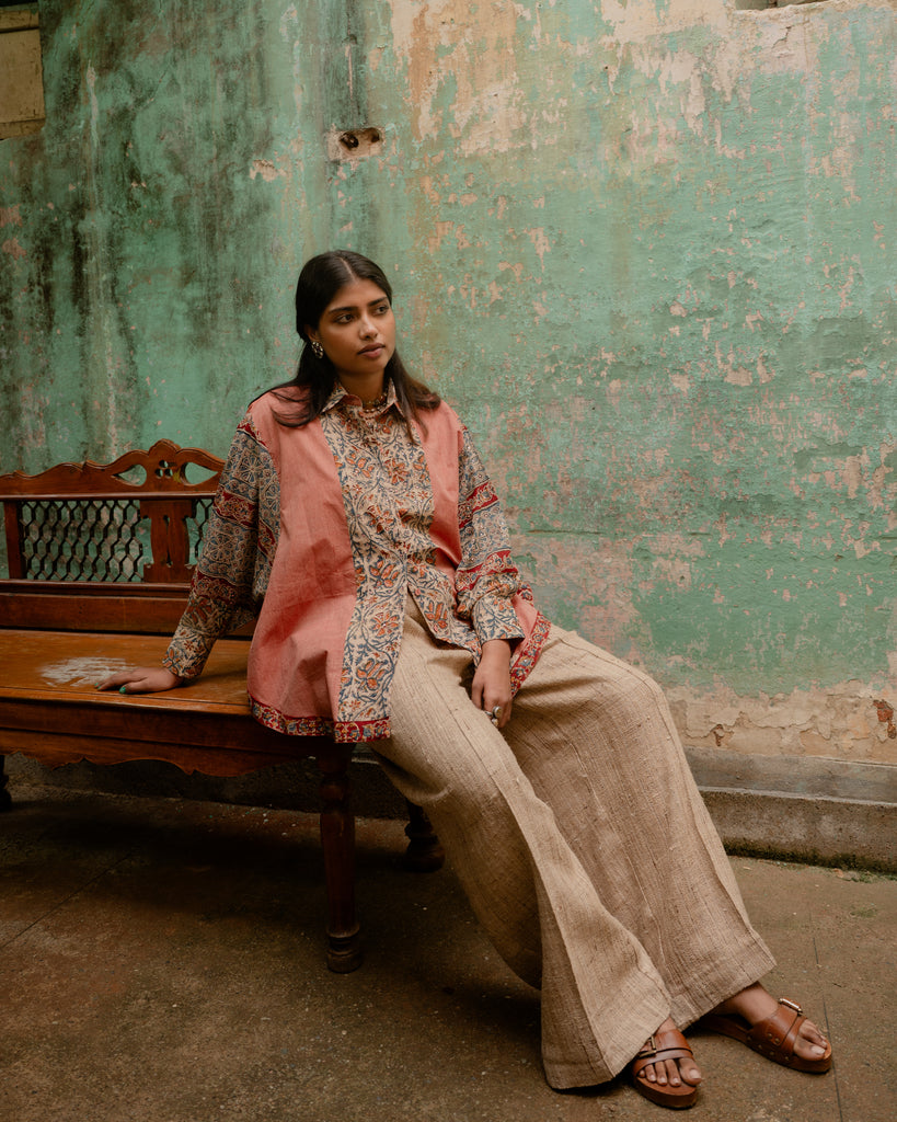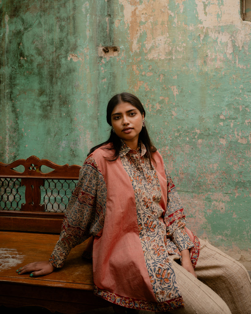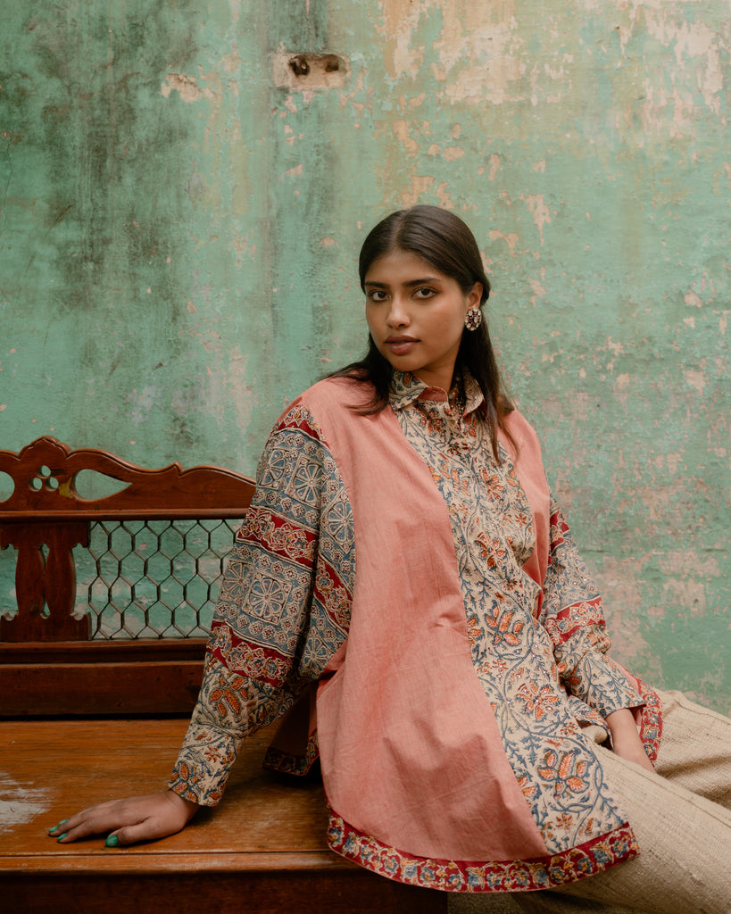 A relaxed silhouette in earthy beige and peach amber, crafted in soft Mangalgiri cotton with intricate block printed panels blending artisanal detail with effortless contemporary style