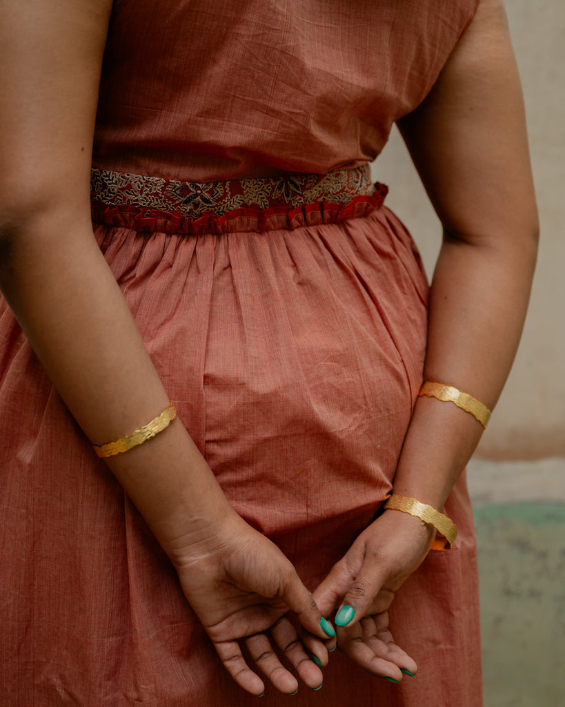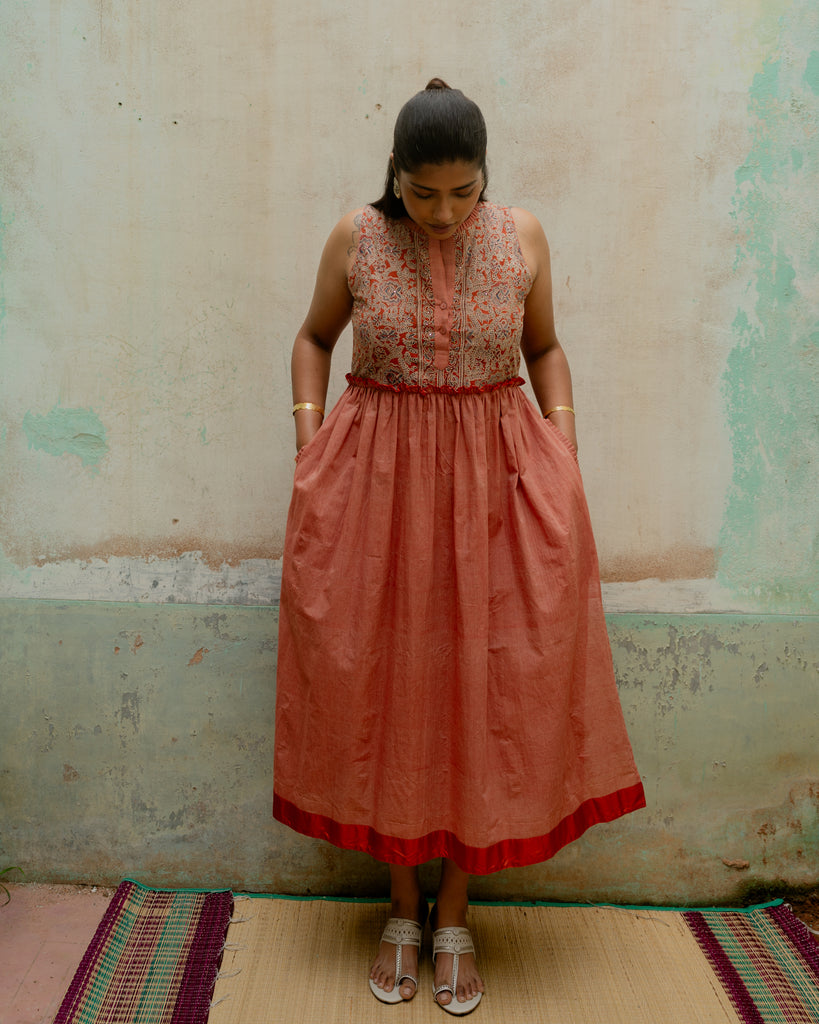 A sleeveless terracotta Anarkali dress with an intricately embroidered yoke, gathered waist and a flared skirt edged with a red zari border