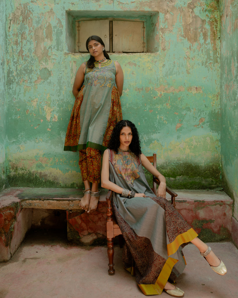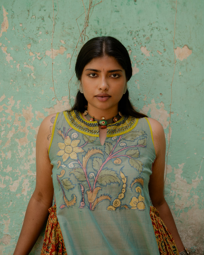 A teal green sleeveless kurta with intricate floral embroidery at the yoke, paired with rust orange brocade side panels and trousers.