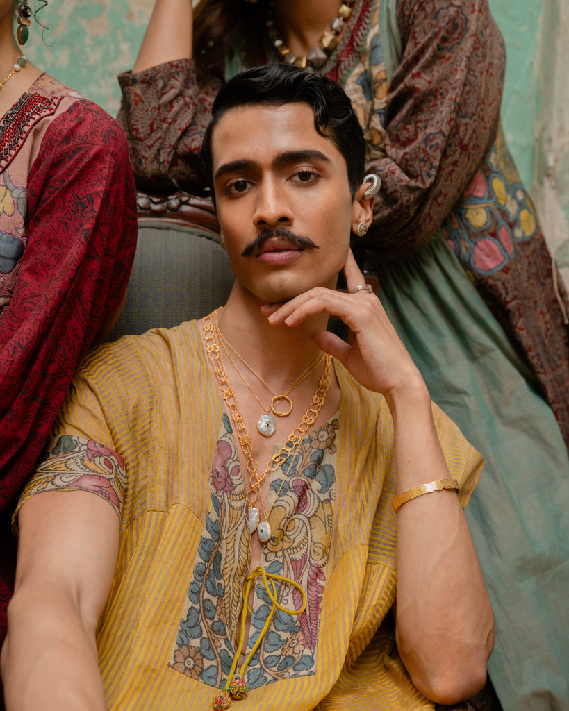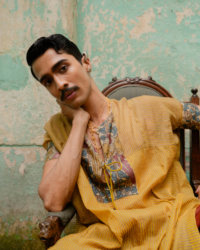 A golden yellow Benarasi Organza striped top with oversized boxy silhouette