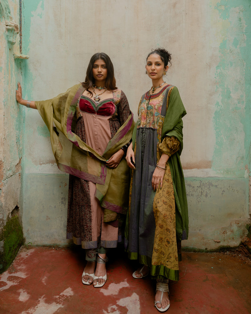 A regal ensemble featuring a maroon velvet bodice paired with a brown block printed overlay.