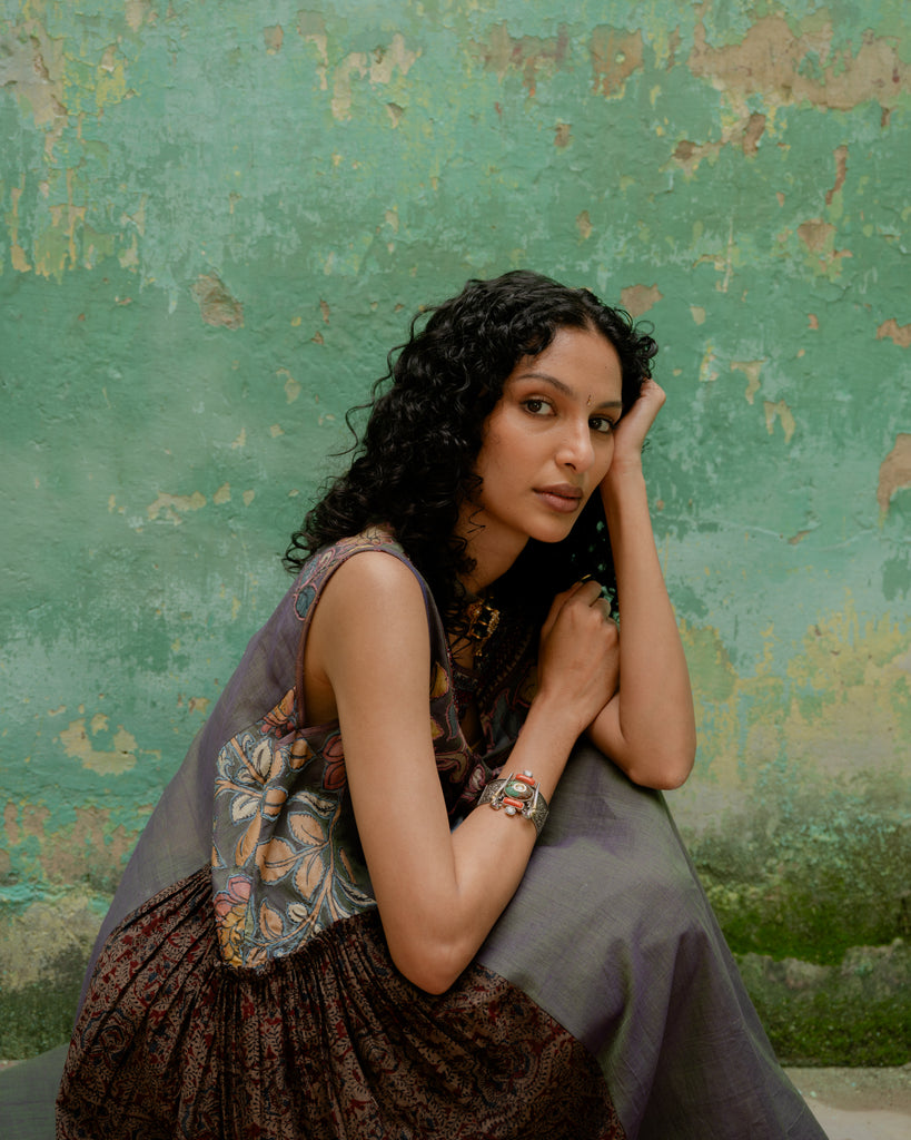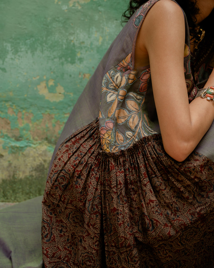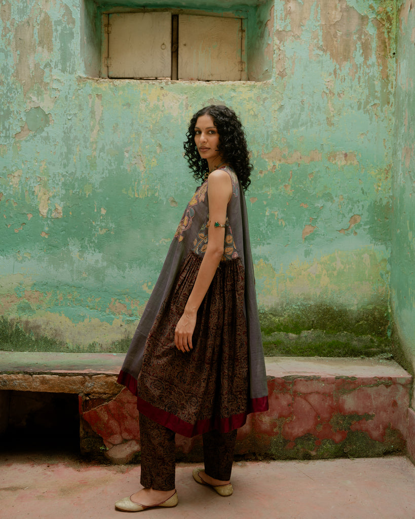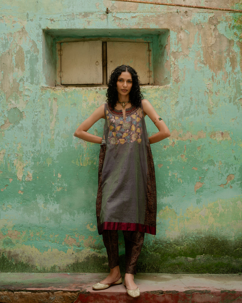 A sleeveless grey Mangalgiri cotton kurta with floral embroidered yoke, contrasted with maroon handwoven panels, paired with matching brocade trousers