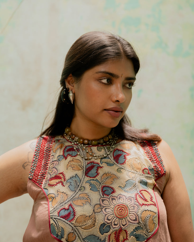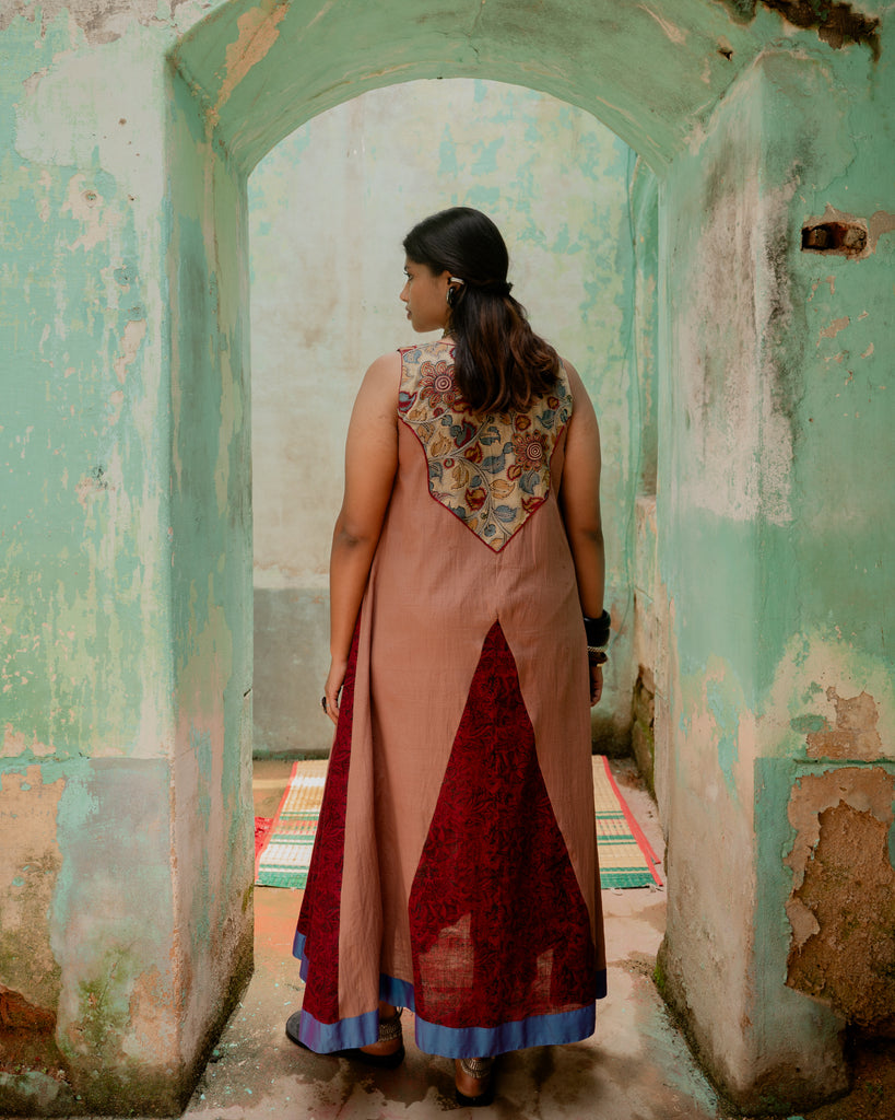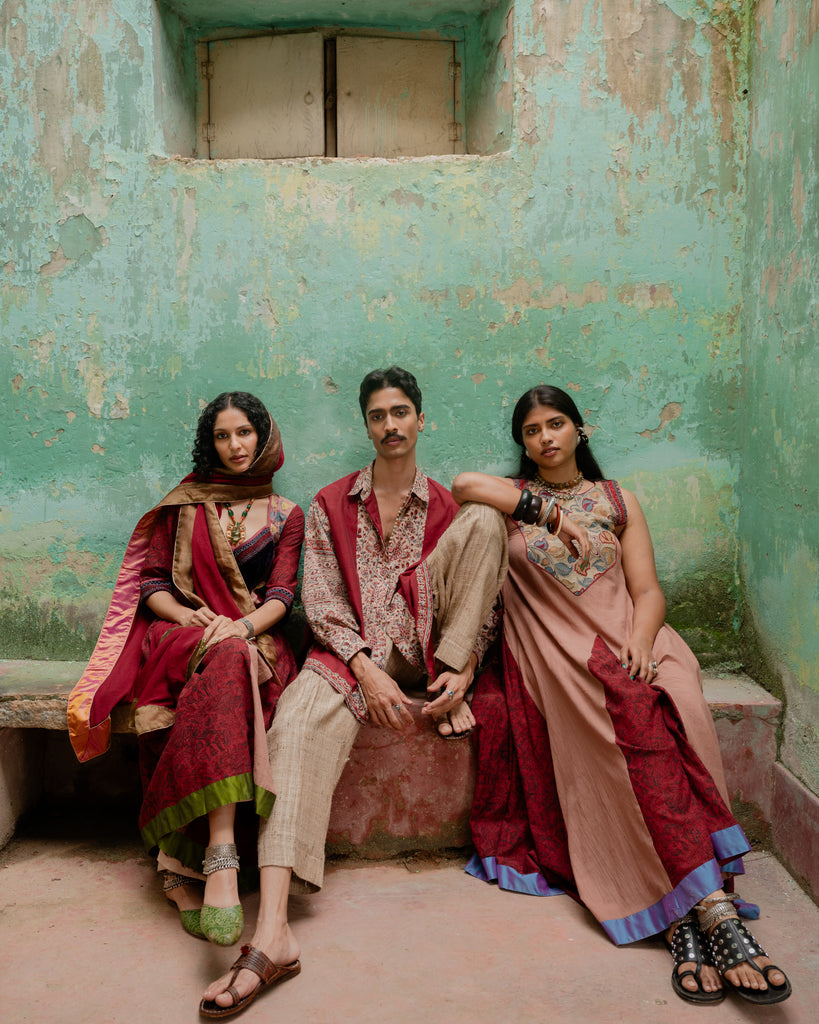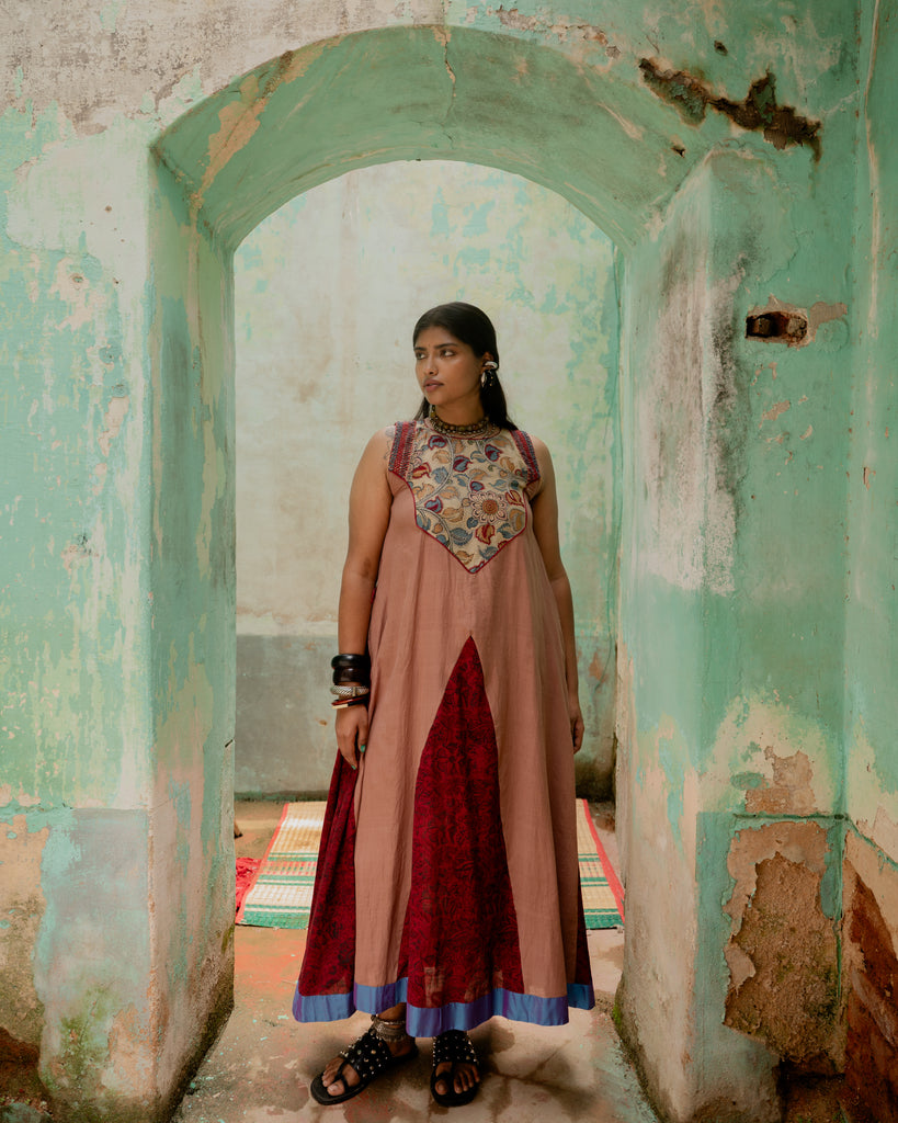 Short amber kurta with maroon block-printed panels. The embroidered neckline and rustic accessories celebrate timeless handcraft.